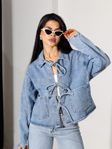 Zilas krāsas džinsa žakete/ jaka ar dekoratīvām bantēm – 15886