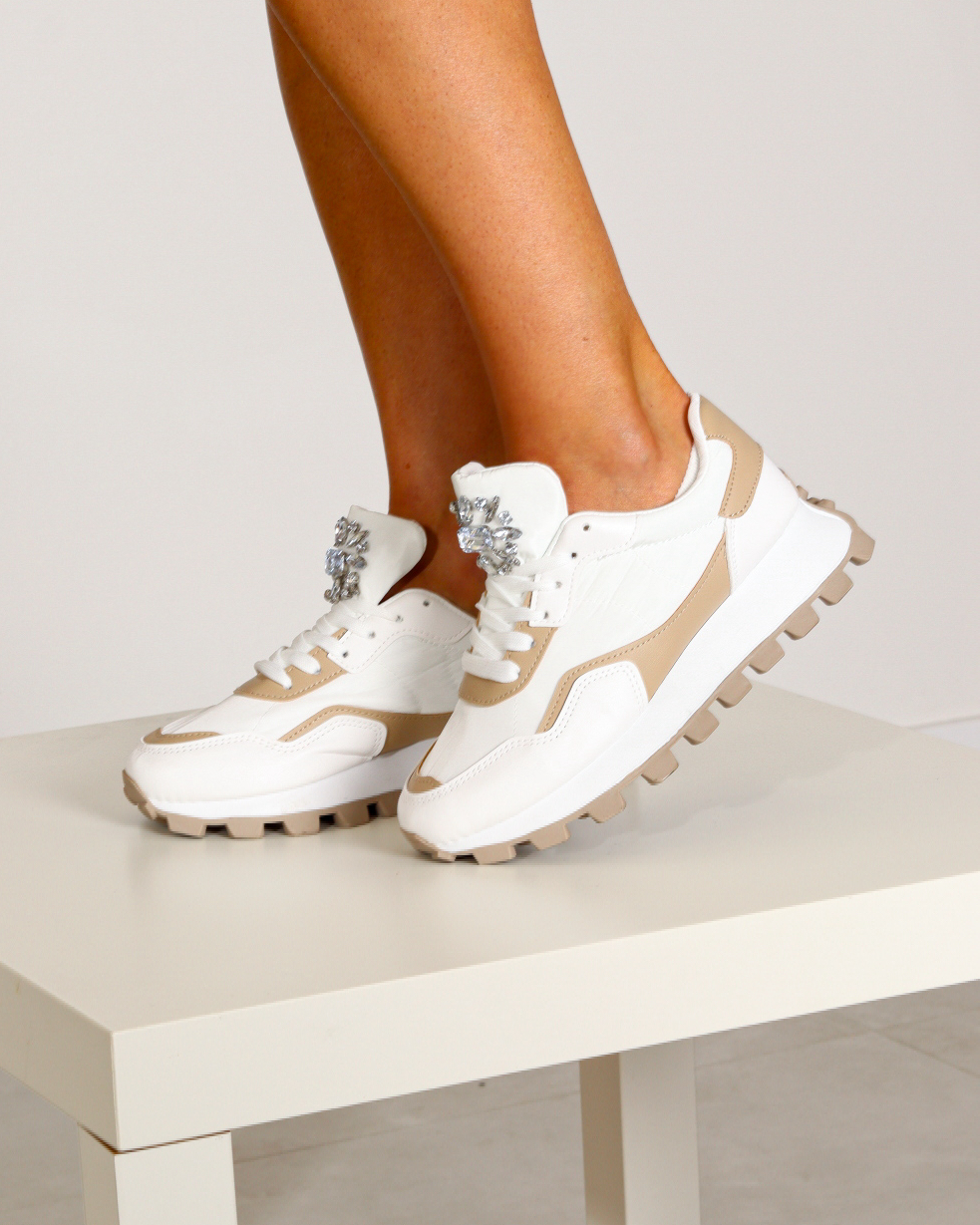 Brīvā laika apavi, sienami ar aukliņām, apaviem ir mirdzošs akcents no stikla akmentiņiem priekšpusē. Apaviem ir paaugstināta, rievota zole.
