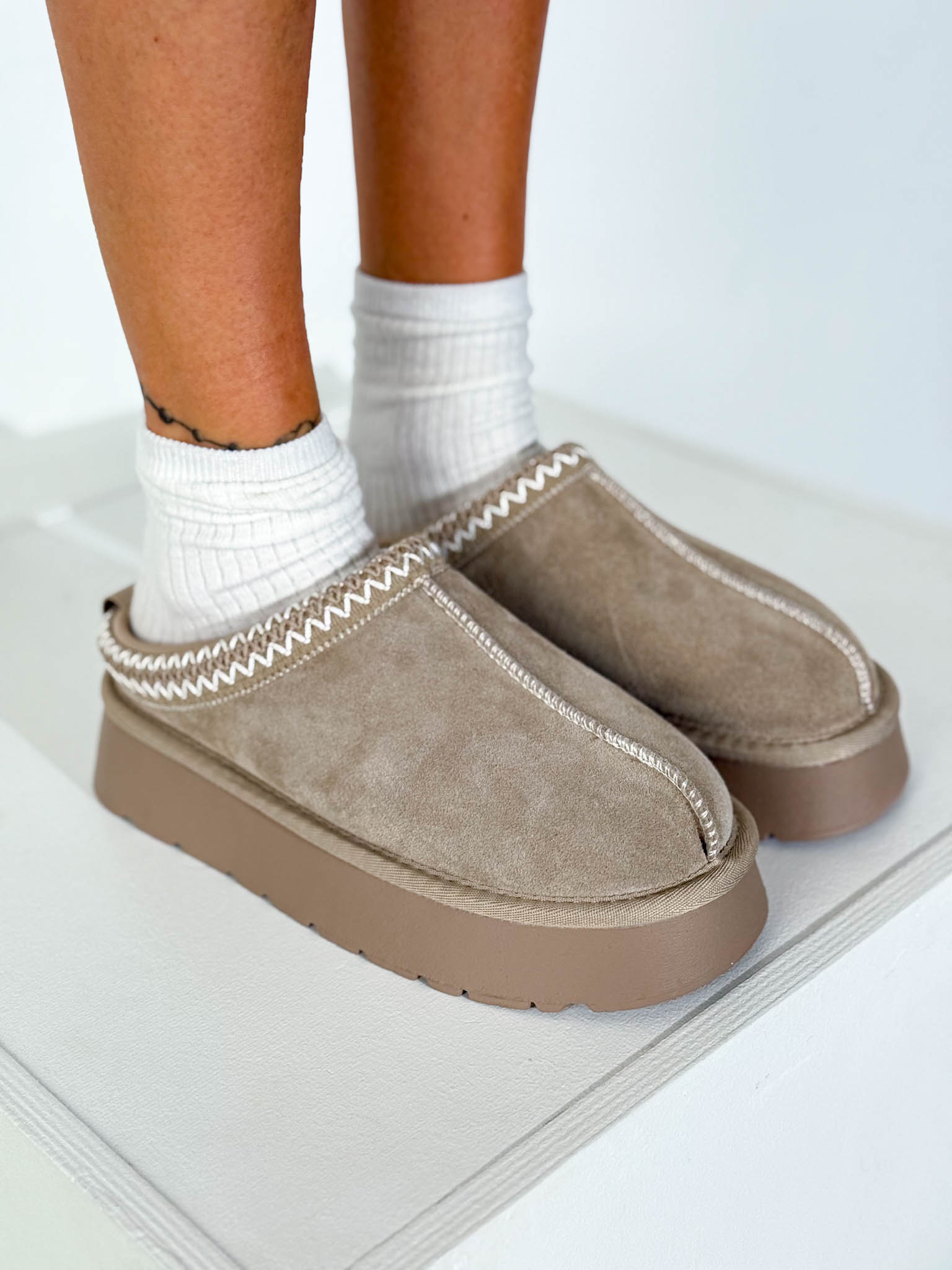 ,UGG’ tipa apavi ar vaļēju papēža daļu, pārklājums ir no dabīgās zamšādas, zolīte rievota reljefa, gomijota, stingra, iekšpēdiņa un apavu iekšpuse siltināta ar mākslīgo vilniņu
