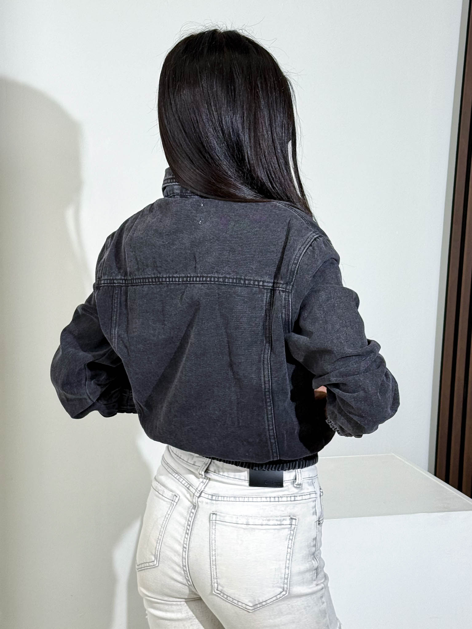 Džinsa auduma bomberjaka ar iestrādātu gumiju piedrukņu galos un jakas apakšdaļā. Priekšpusē ir iestrādātas divas neaizveramas kabatas. Jakai ir apkakle.