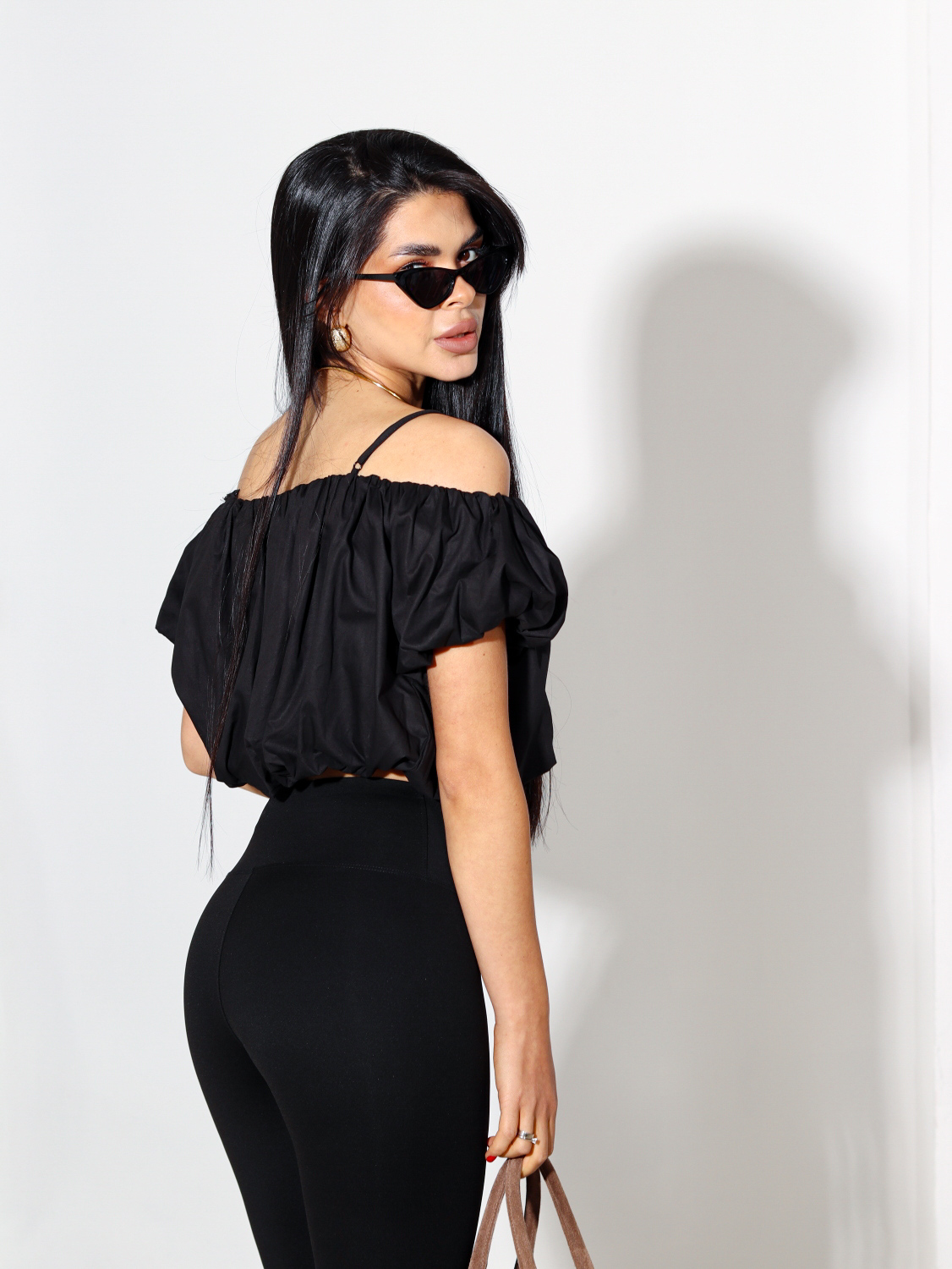 Īss tops ar regulējamām plecu lencītēm , nolaistām balona piedurknēm un topam ir dubults audums , kā arī savilkums apakšdaļā.