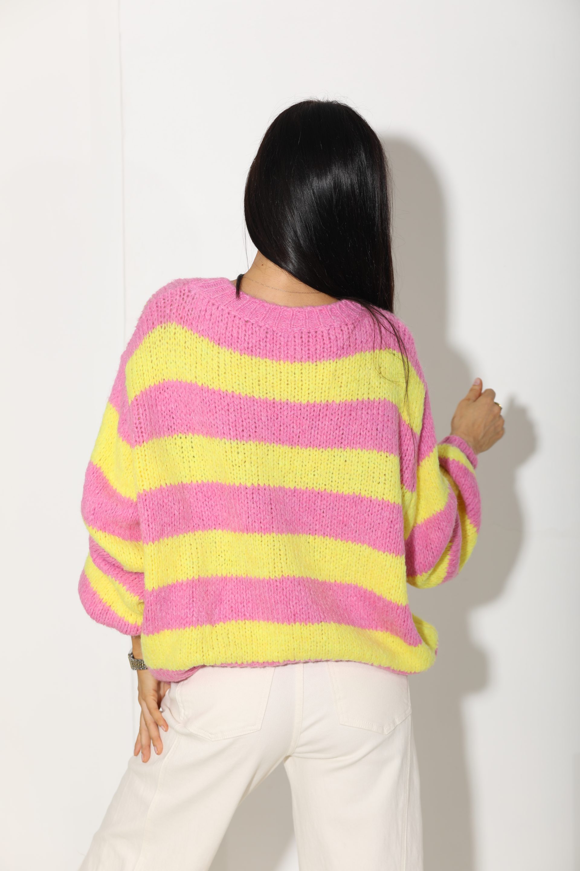 Rozā adīts džemperis ar dzeltenām svītrām – 16167