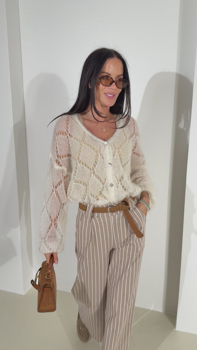 Perforēta adījuma, mohēras dzijas adīta jaka ar "V" veida dekoltē daļu un garām piedurknēm.