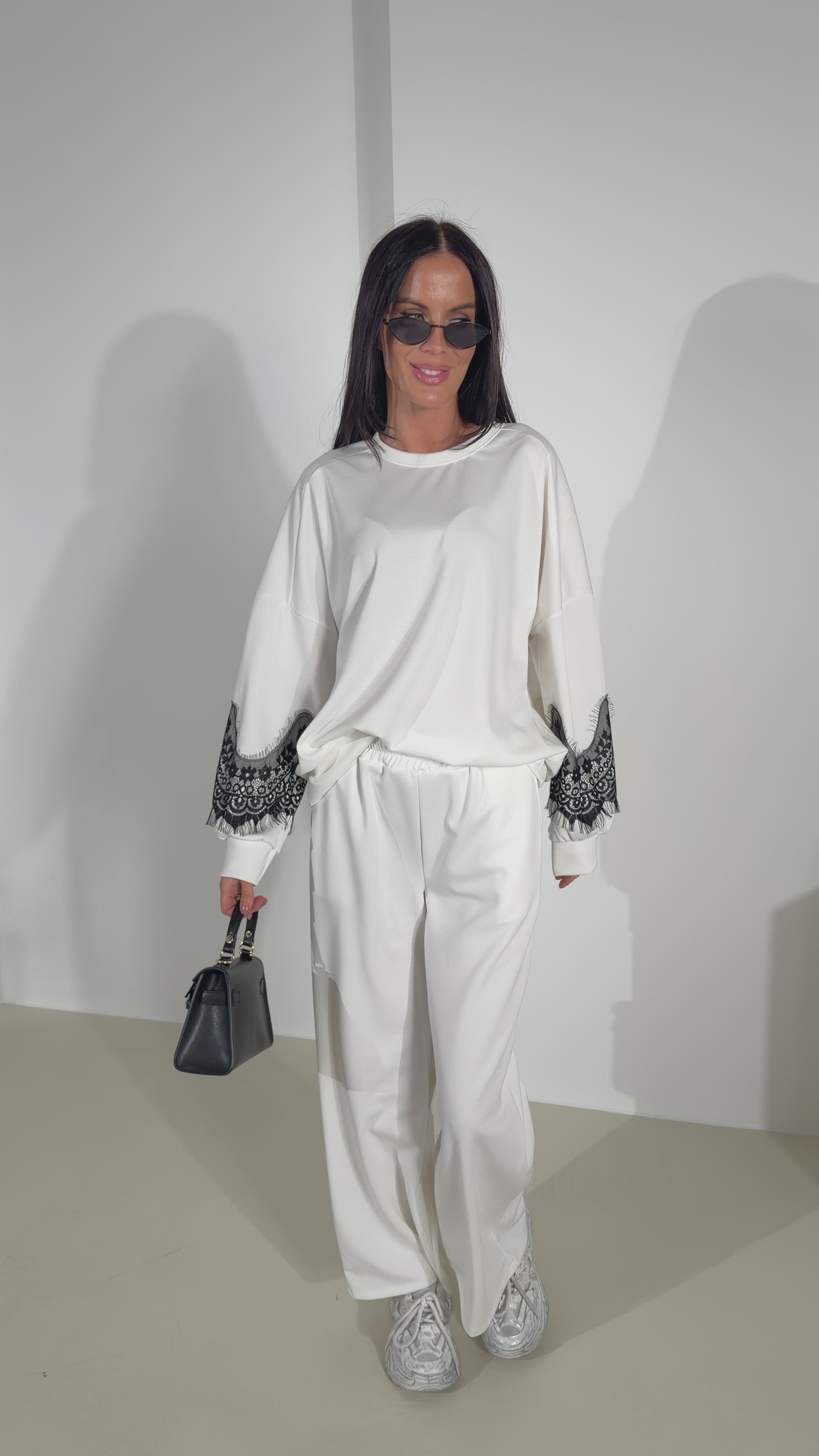 Komplekts ar mežģīnes akcentu džempera piedurknē. Biksēm vidukļa daļā ir iestrādāta gumija un ir kabatas.