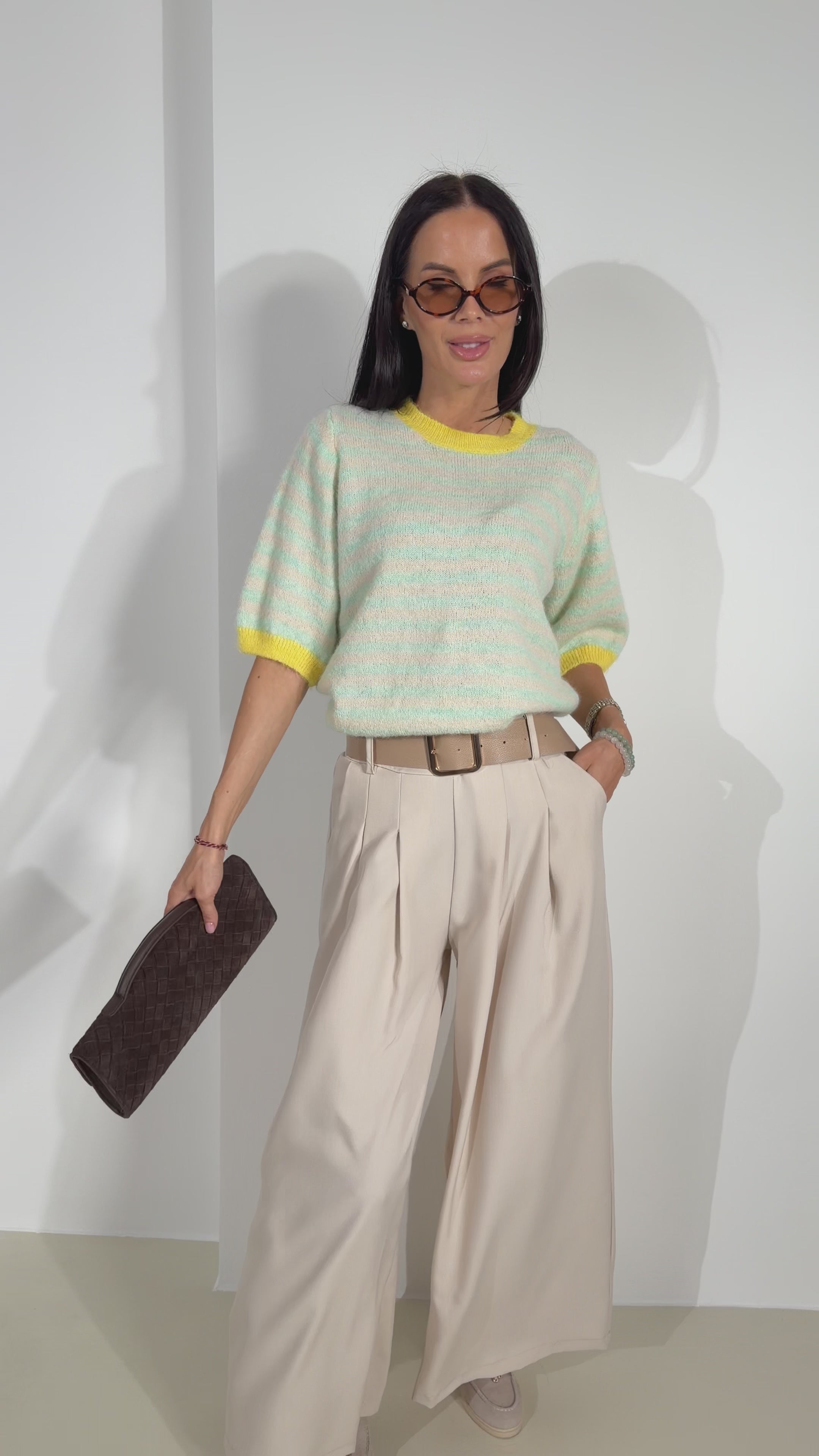 Klassikas püksid ar brūnas värvi platu jostu. Priekšpusē ir iestrādātas četras iešuves un divas kabatas. Bikšu stari ir plata un taisna piegriezuma. Mugurpusē jostas osas ir iestrādāta gumija.
