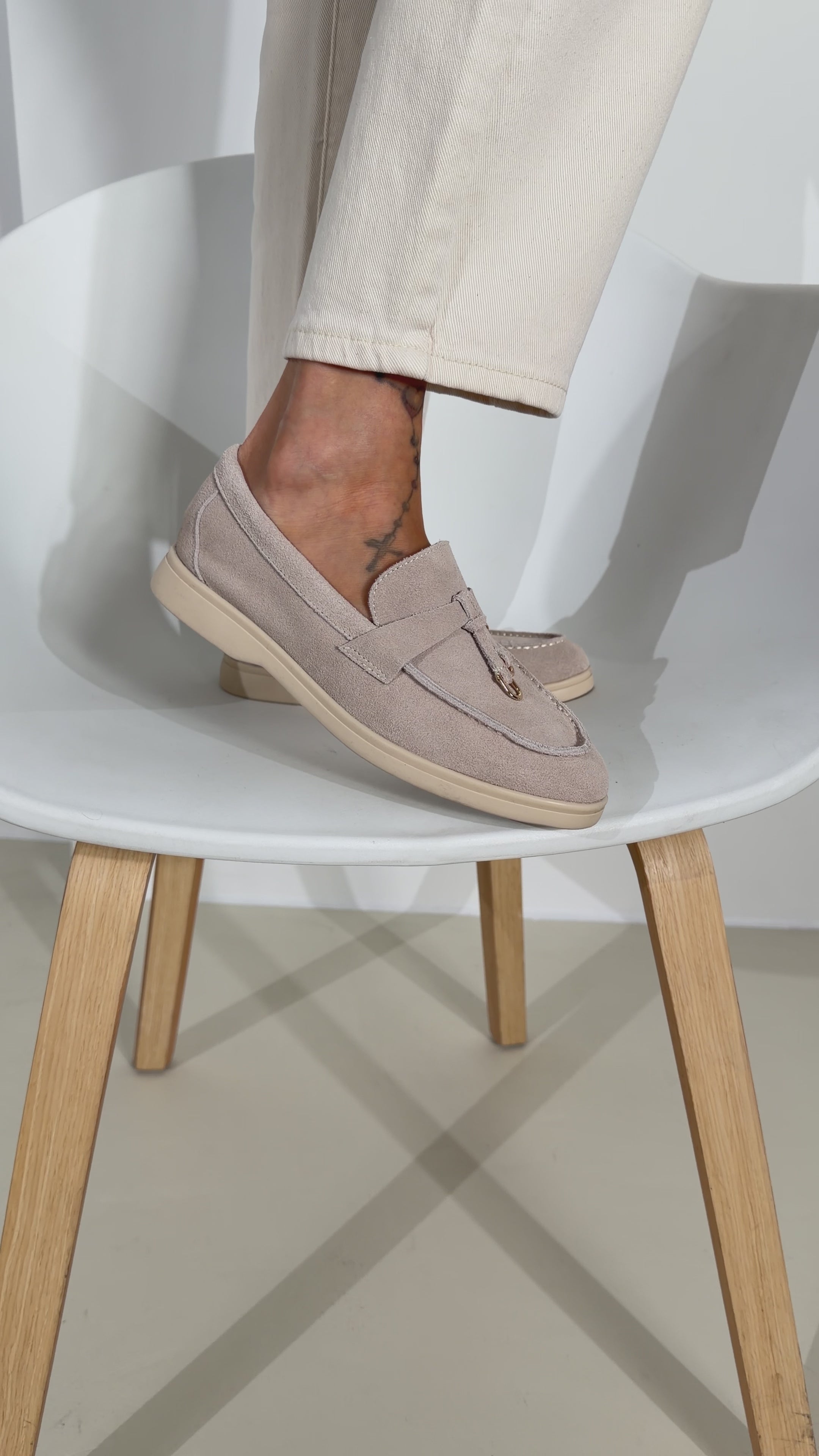 Dabīgās zamšādas kurpes ar akcentu augšpusē (zelta krāsas pušķīti), apavi ir slēgti uz zemu stabilu zolīti, ļoti ērtas ar ādas iekšpēginu