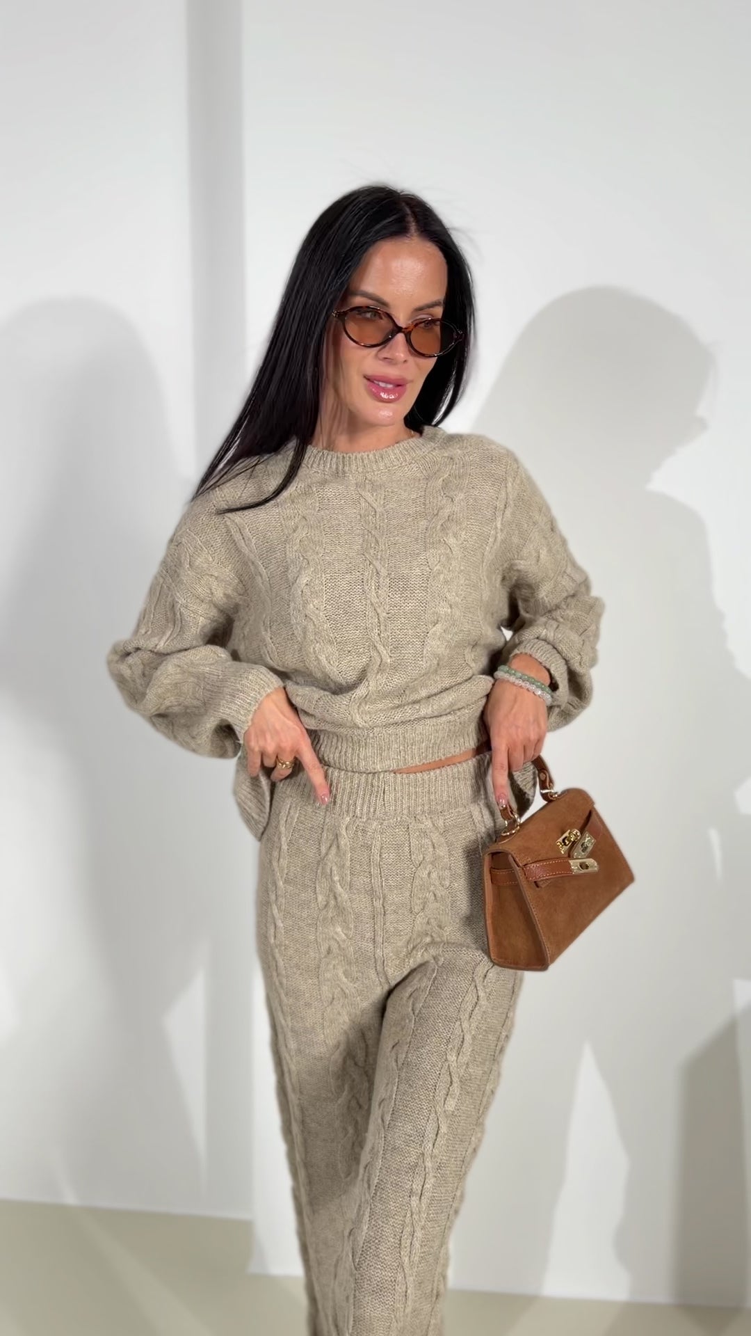 Bēšas värvi komplektā ietilpst džemperis un püksid.