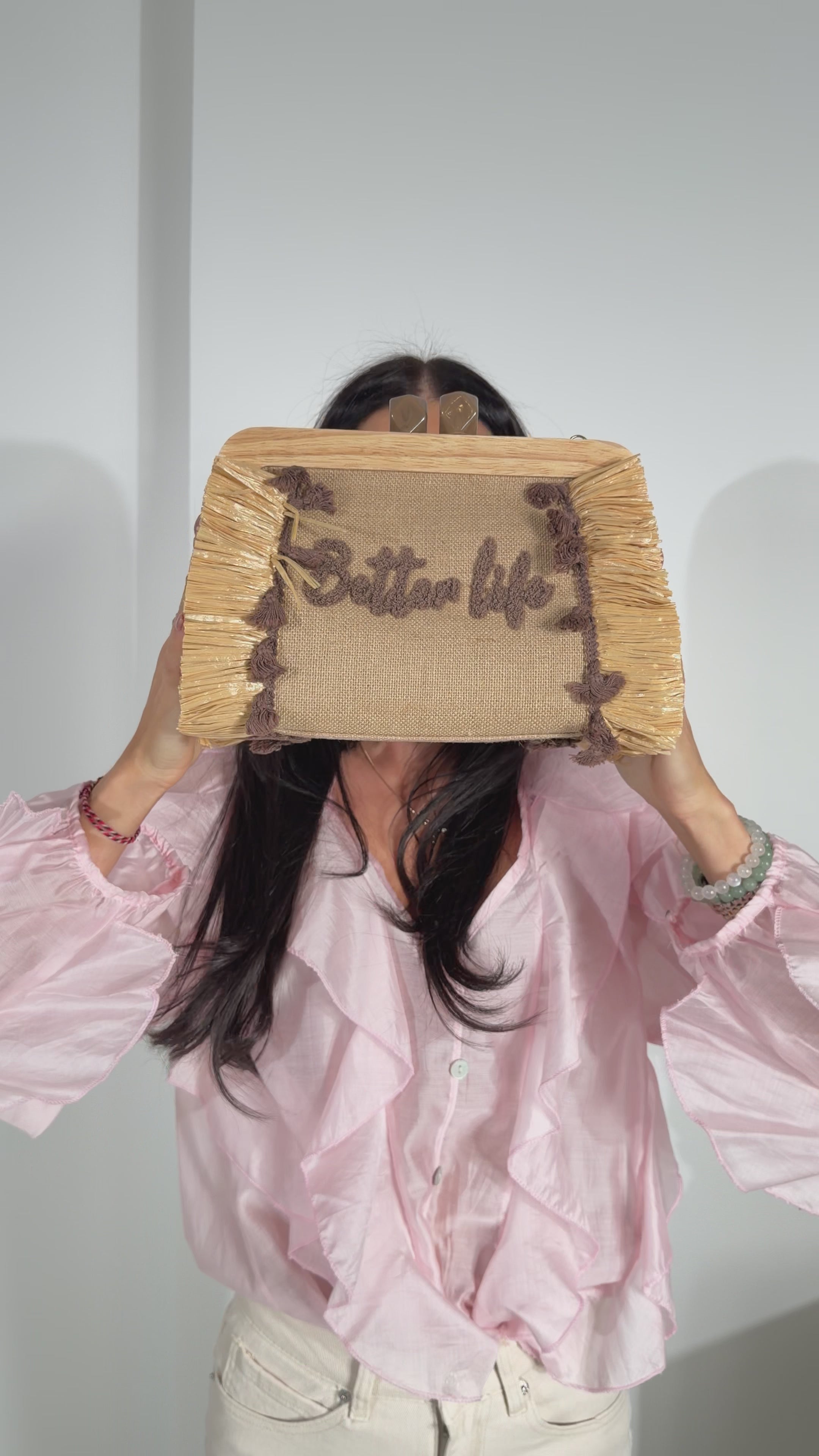Stilizēta vasaras soma ar izšūtu uzrakstu "Better life" .