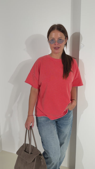Basic cilpiņkokvilnas tops ar noapaļotu, nošūtu kakla daļu, īsām piedurknēm un brīvas piegrieznes tipa modelītis, topam nav aptuveni apakšmala un roku maliņas