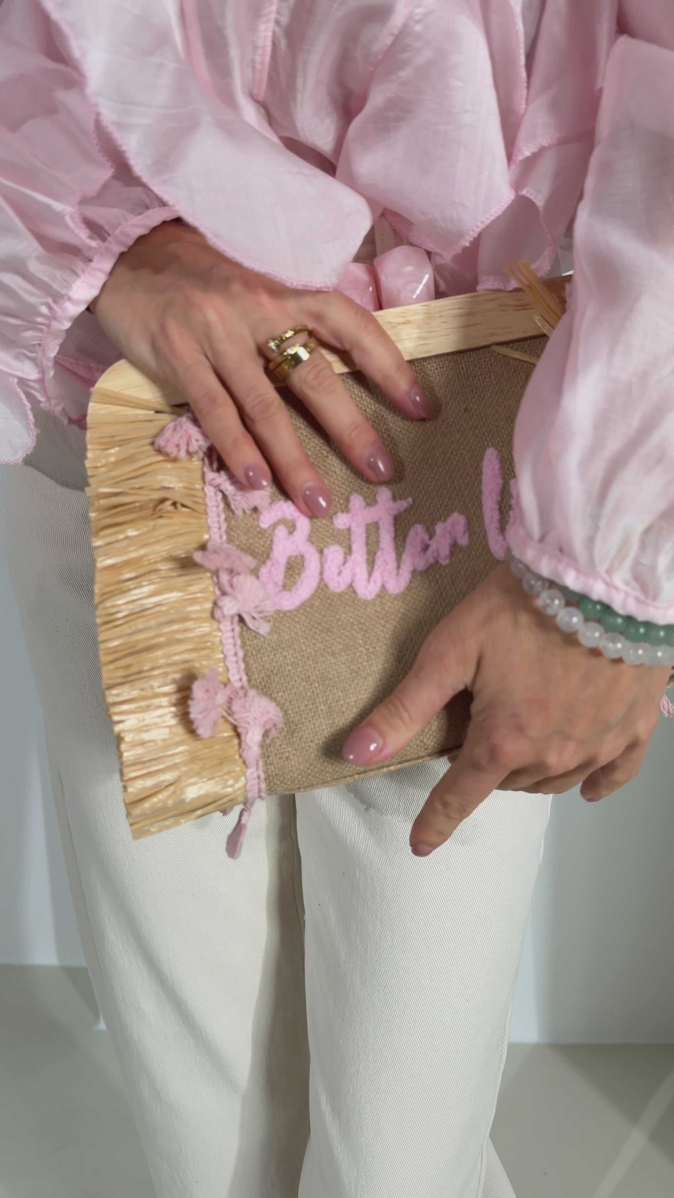 Stilizēta vasaras soma ar izšūtu uzrakstu "Better life" .