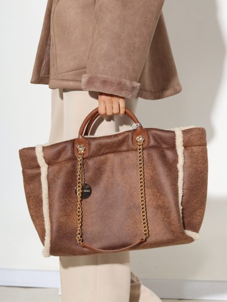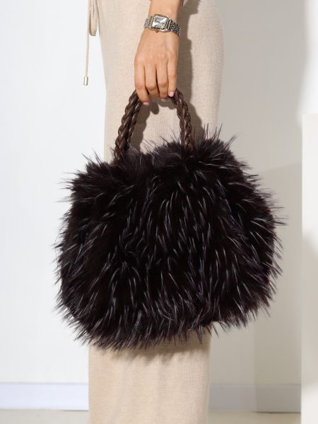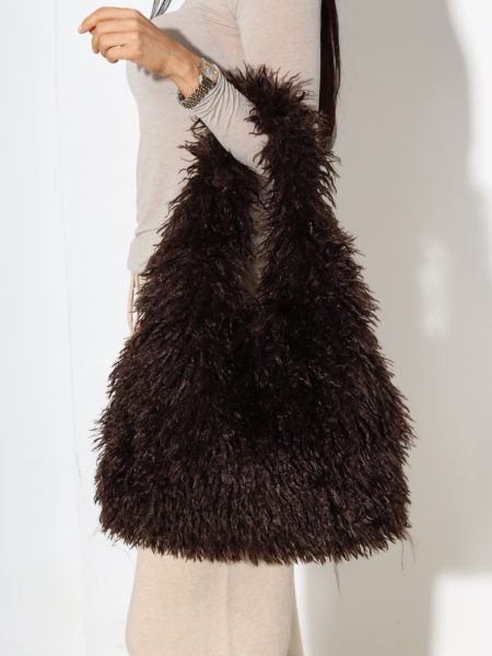 Šoko/brūna pūkaina soma ar pītu rokturi- 17427
