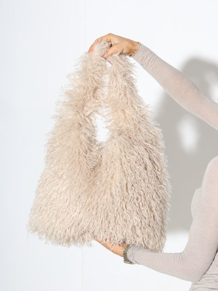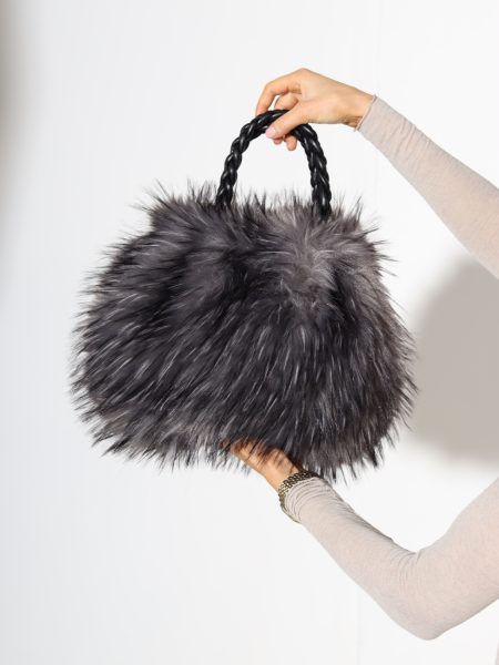 Pelēka pūkaina soma ar pītu rokturi- 17370