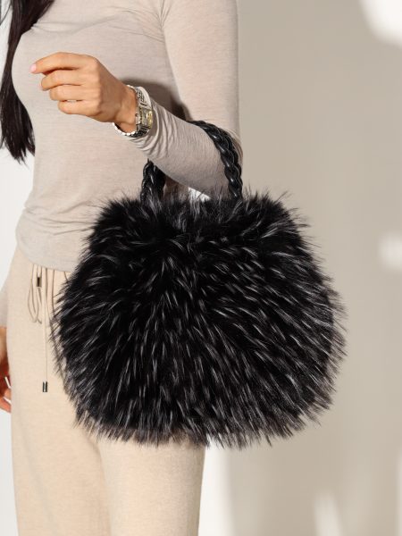 Melna pūkaina soma ar pītu rokturi- 17369