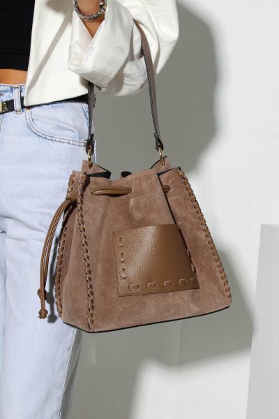 Gaiši brūna, zamšādas soma ar savelkamu augšdaļu – 16075