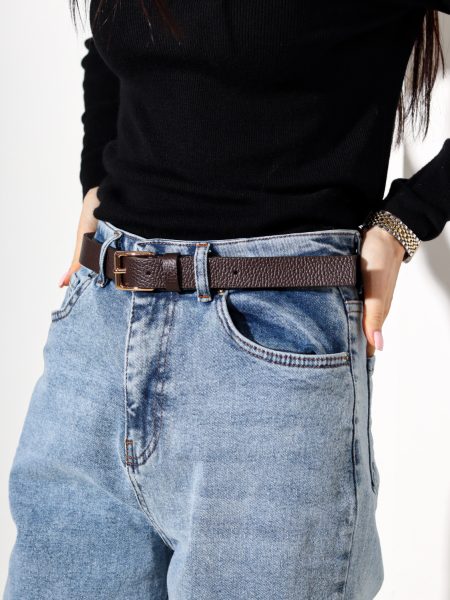 Tumši brūna smalka ādas josta ar zelta sprādzi – 13897
