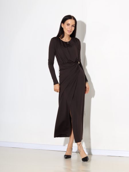 Brūna gara kleita ar savilkumu sānā un zelta furnitūras dekoru – 17562