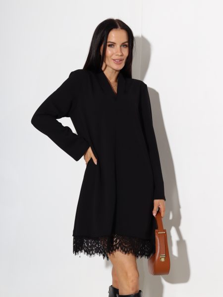 Melna īsa kleita ar ,,V” veida izgriezumu un nošūtu mežģīni – 17540