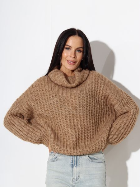 Camel krāsas liela adījuma mohēras džemperis ar dubultu atloku – 17713