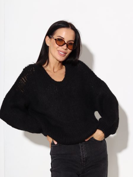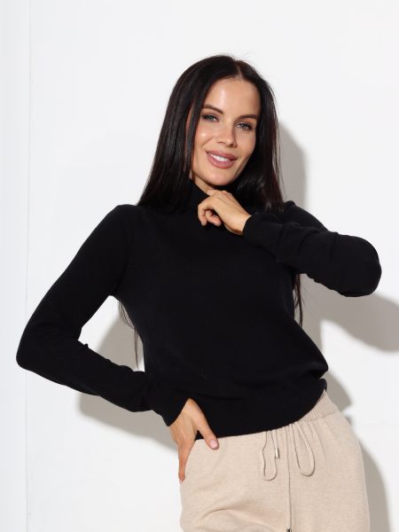 Melns, smalka adījuma džemperis ar paaugstinātu kakla daļu – 17351