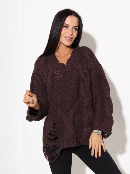 Šoko/brūns džemperis pīnes rakstā ar plēsumiem – 17090