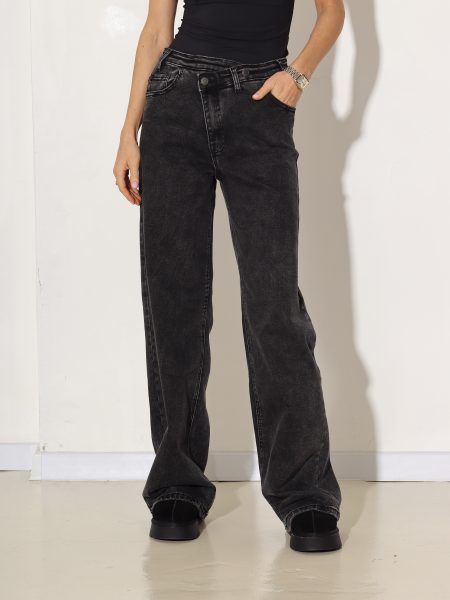 Pelēkmelnas džinsa bikses ar slīpu pogas aizdari – 16922
