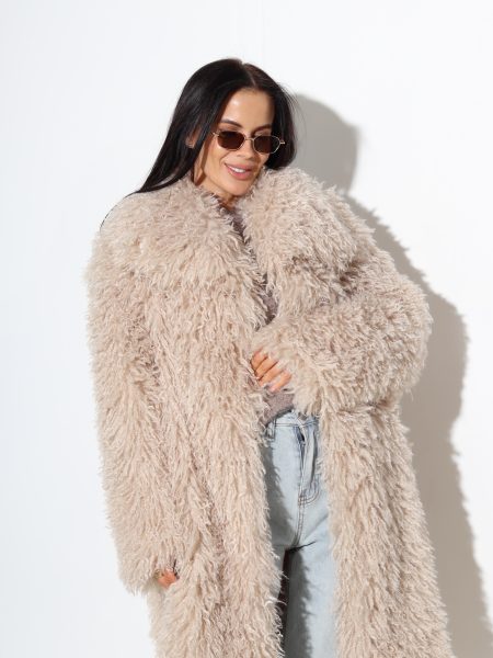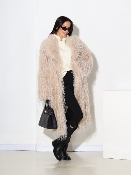 Bēšs garš, brīva piegriezuma m/ā kažoks ar dažāda garuma spalvu – 17327