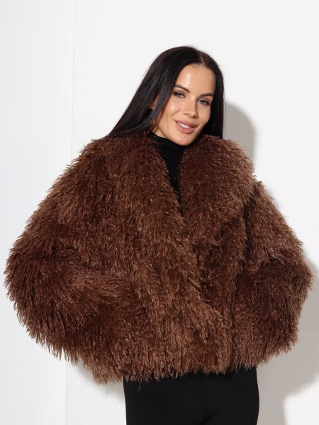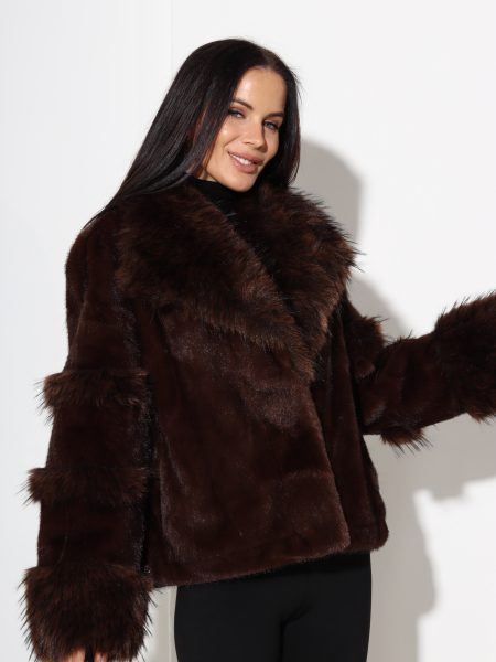 Brūns īss kažoks ar dažāda garuma spalvu un savelkamu apakšdaļu – 17317