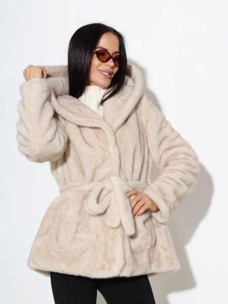 Bēšs īss, gludas spalvas m/ā kažoks ar kapuci un jostu – 17319