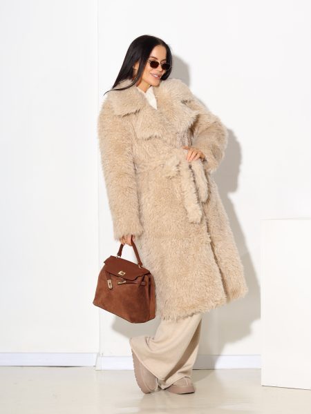 Bēšs, garš viļņotas spalvas m/ā kažoks ar jostu – 17328