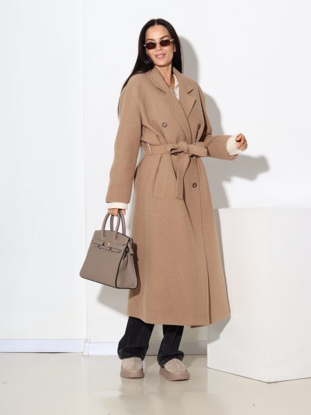 Bēšas krāsas mētelis ar jostiņu, vilnu sastāvā – 17445