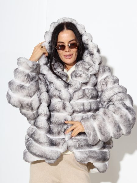 Balts + pelēks horizontāli frakcionēts m/ā kažoks ar kapuci – 17310