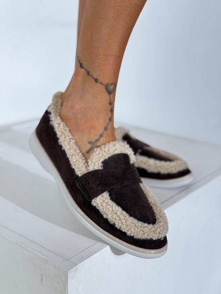 Brūnas/šoko zemas kurpītes ar pūciņas akcentu – 16043