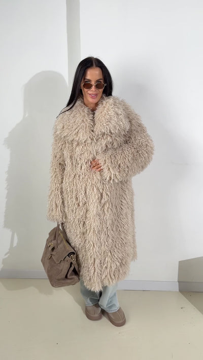 Bēšas krāsas garš kažociņš ar viļņotu spalvu. Kažokam ir āķīšu aizdare, kabatas un pieskaņotas krāsas odere.