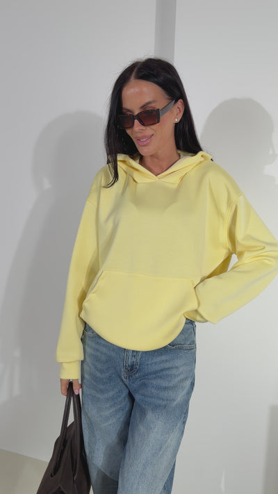 Mīksta materiāla džemperis ar kapuci un lielu kabatu priekšpusē.
