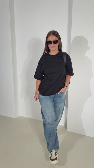 Basic tops ar noapaļotu, nošūtu kakla daļu, īsām piedurknēm un brīvas piegrieznes tipa modelītis