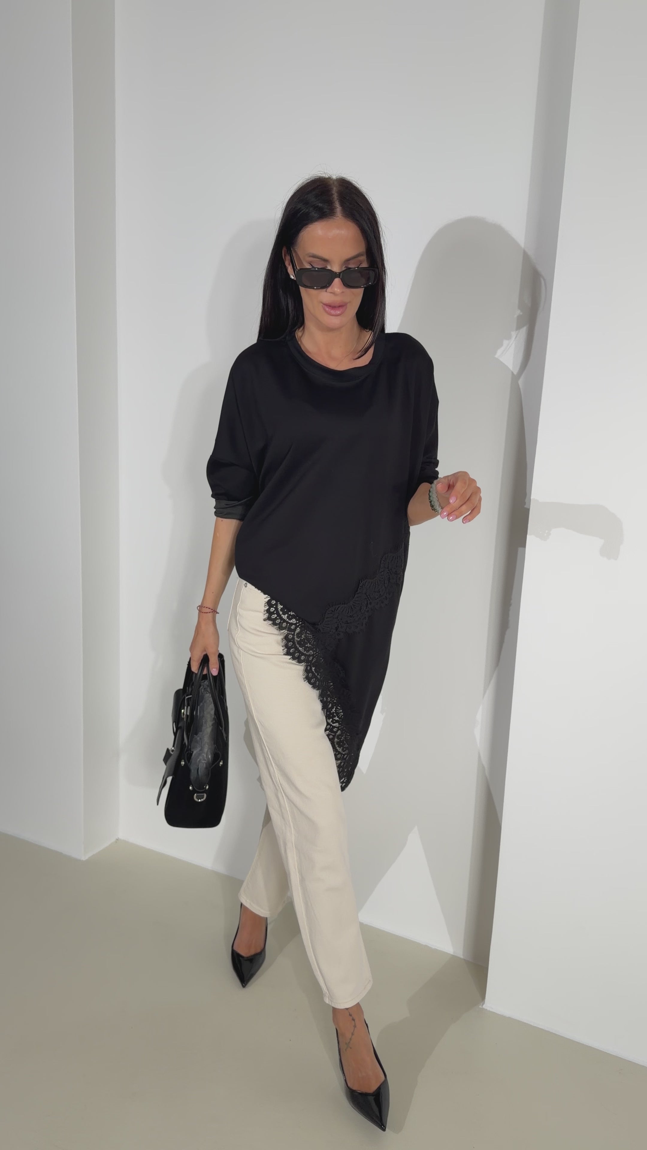 Melns tops ar pagarinātu apakšmalu un mežģīņu akcentu - 18299