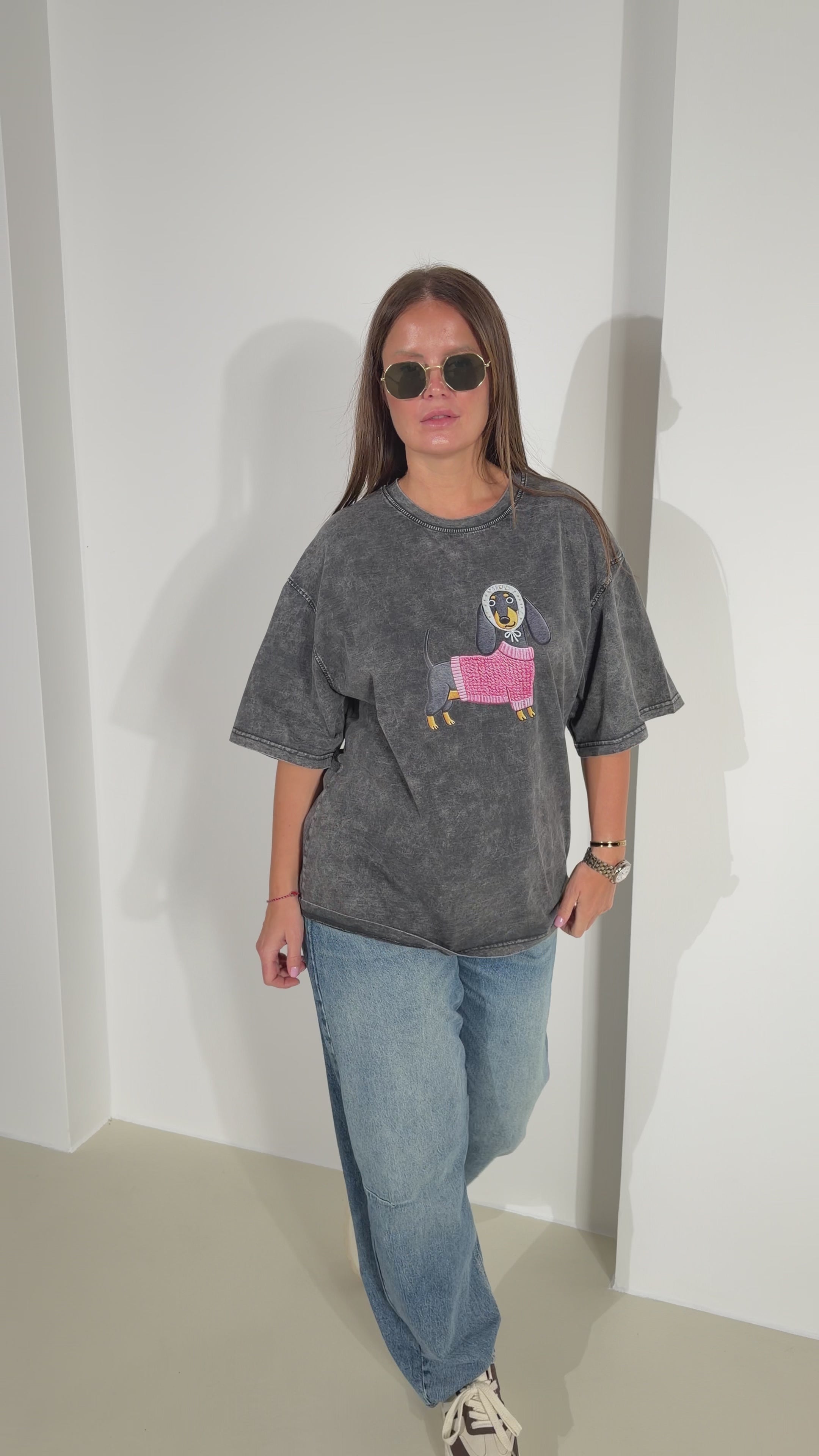 Basic tops ar noapaļotu, nošūtu kakla daļu, īsām piedurknēm un brīvas piegrieznes tipa modelītis ar suņa attēlu+ uzrakstu krūšu zonā