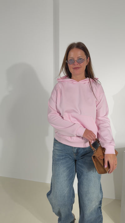 Mīksta materiāla džemperis ar kapuci un lielu kabatu priekšpusē.