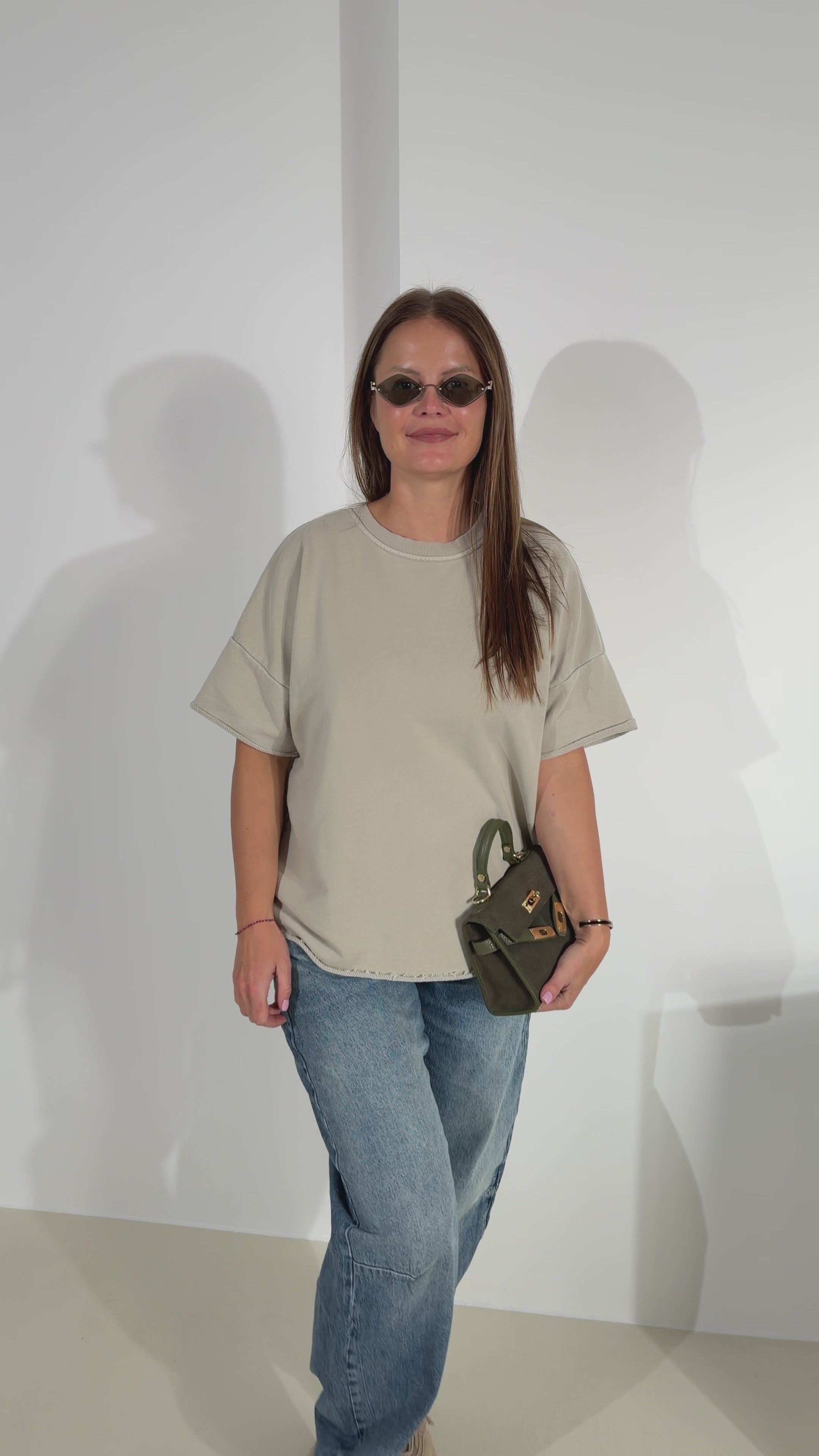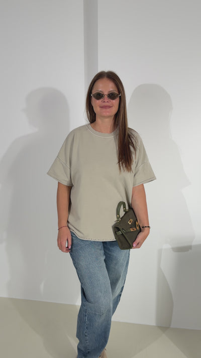Basic cilpiņkokvilnas tops ar noapaļotu, nošūtu kakla daļu, īsām piedurknēm un brīvas piegrieznes tipa modelītis, topam nav apstrādāta apakšmala un roku maliņas