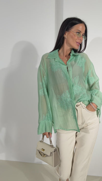 Brīva tipa, pogājams krekls ar garām piedurknēm un apkakli. Krekla audumā ir smalks, pieskaņotas krāsas izšuvums.
