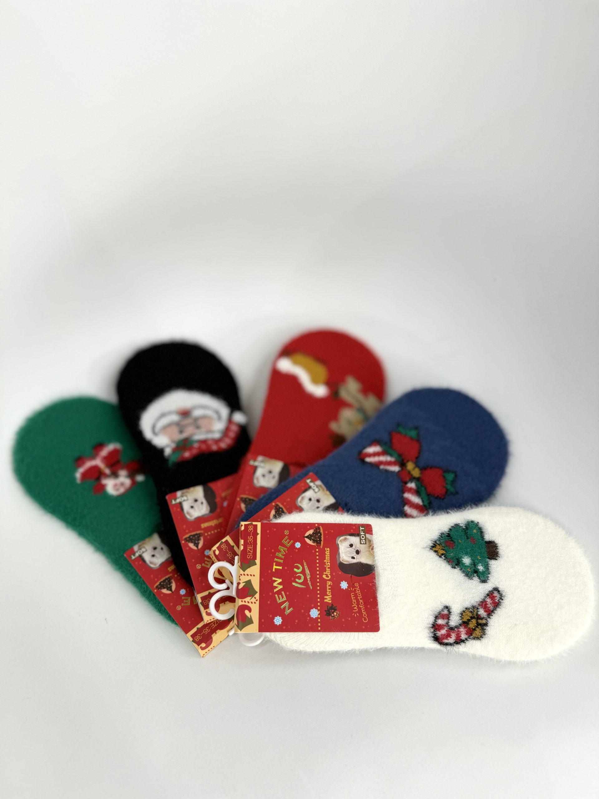 Mix krāsu zeķu/pēdiņu komplekts (melna, zila, zaļa, sarkana, balta), zeķītes no mīkstas ūdeles dzijas, ar ieadītu Ziemassvētku motīvu
