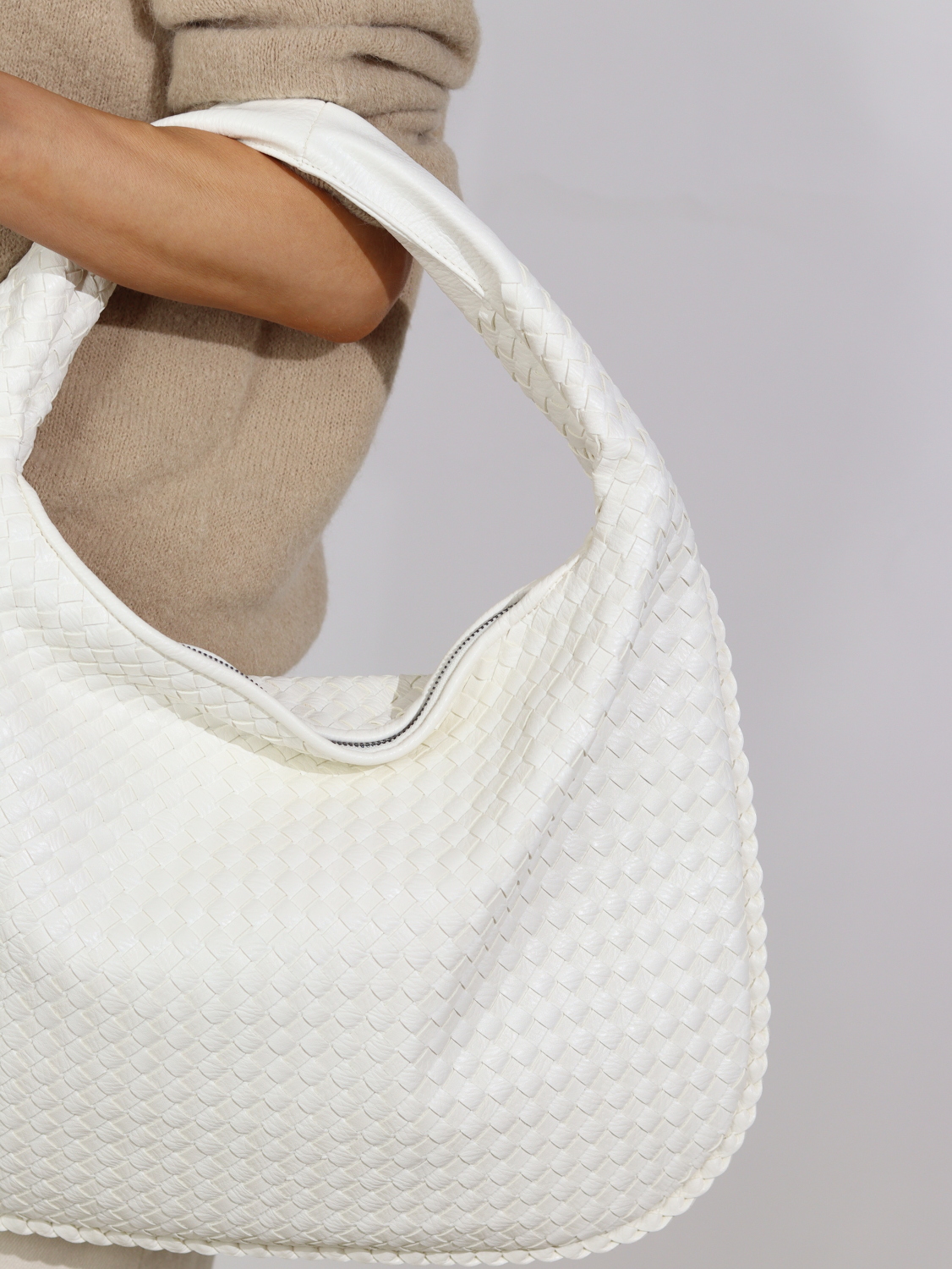 Baltas krāsas, lielā soma no mākslīgās ādas ar pītu virsmu. Soma ir aizverama ar iestrādātu rāvējslēdzēju. Somas iekšpusē vienā pusē ir ir neaizverama kabata, otrā pusē ir divas kabatas , kuras var aizvēŗt ar rāvējslēdzēju un viens neliels nodalījums.