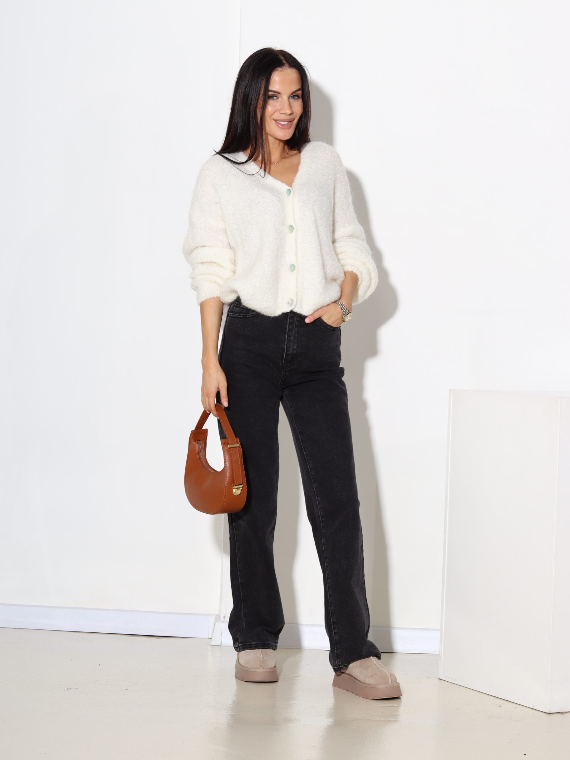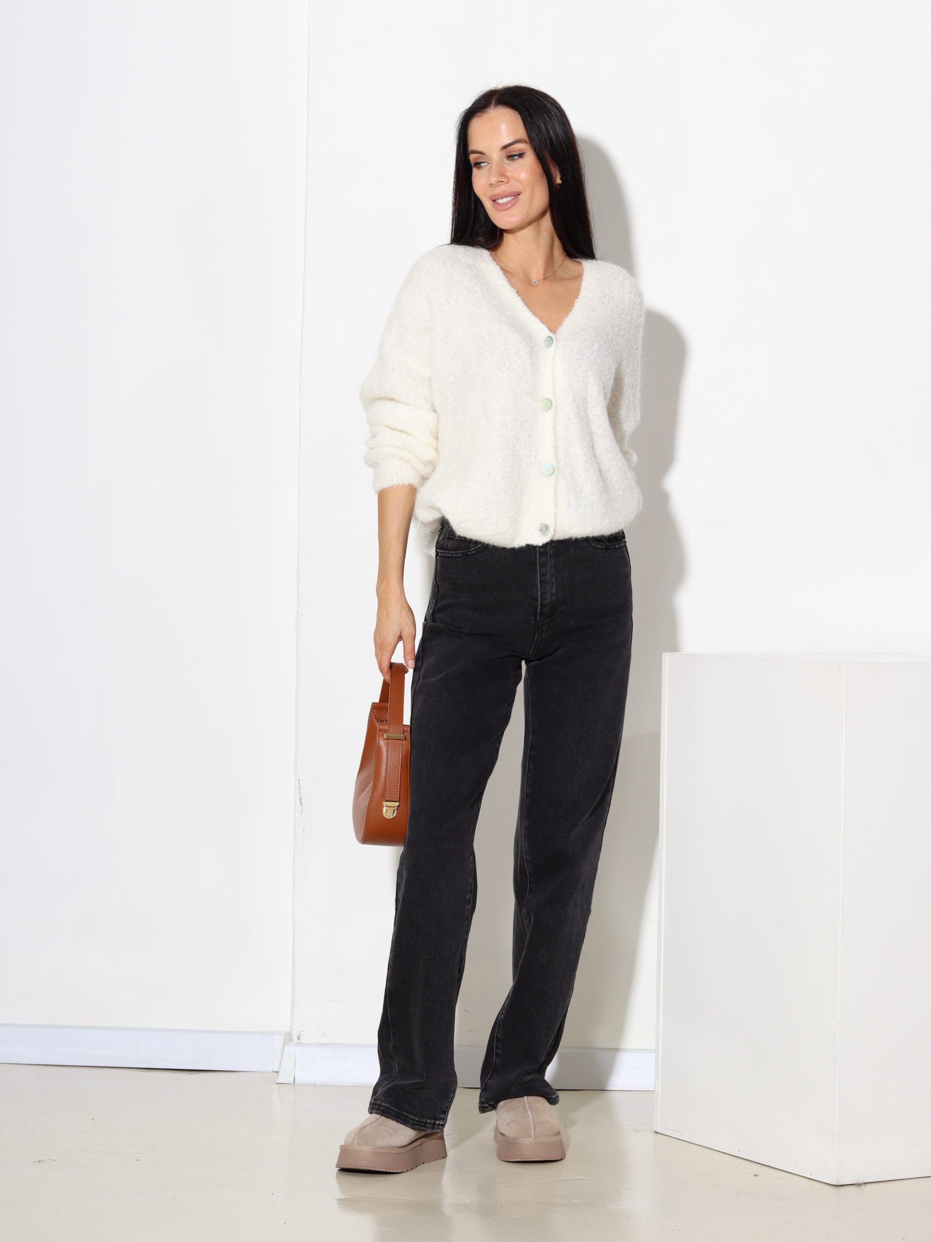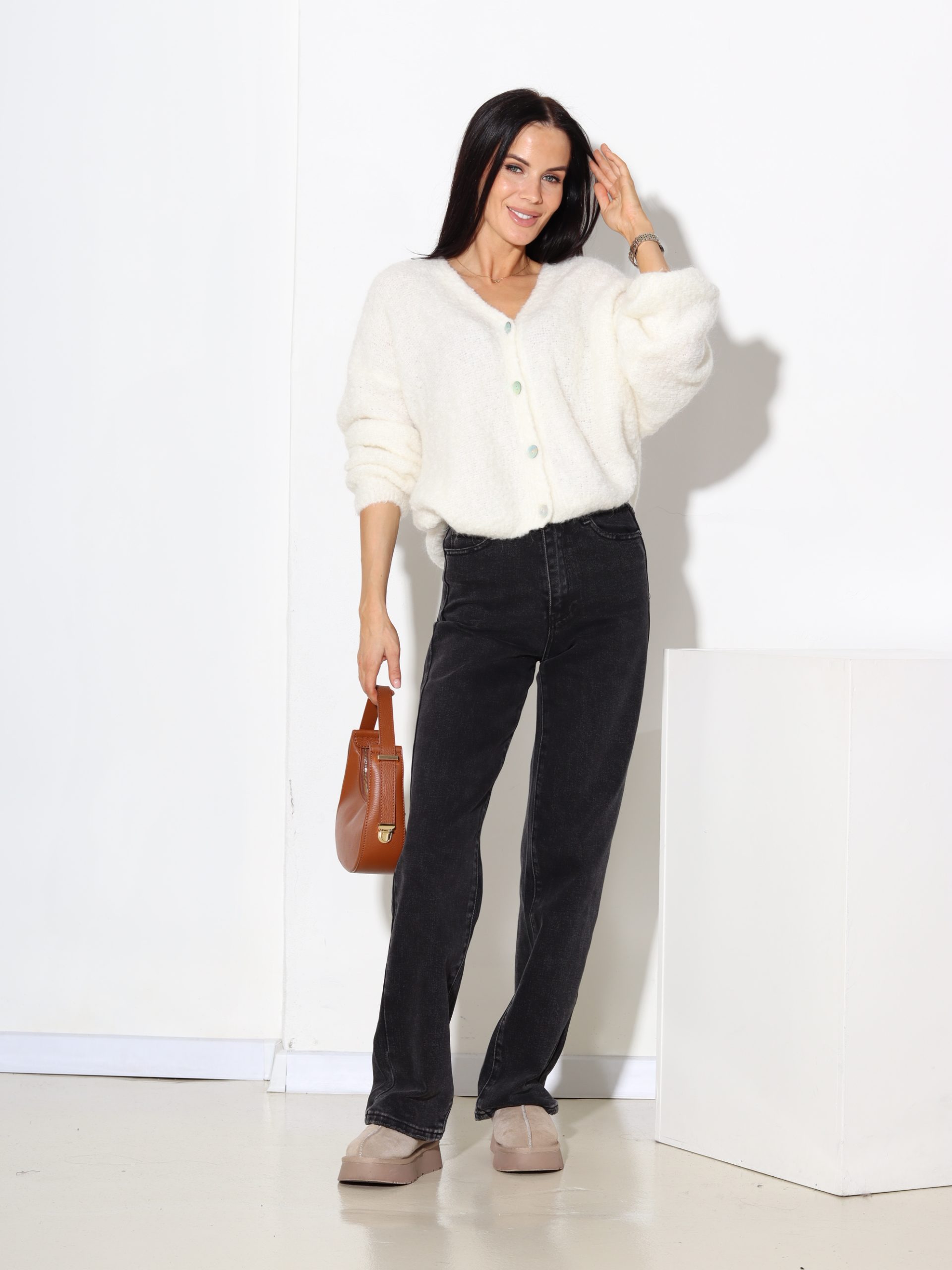 Adīta jaciņa, mezgliņdzijas, labiskā adījuma rakstā ar V veida dekoltē, mīksts un silts ar kvalitatīvu sastāvu