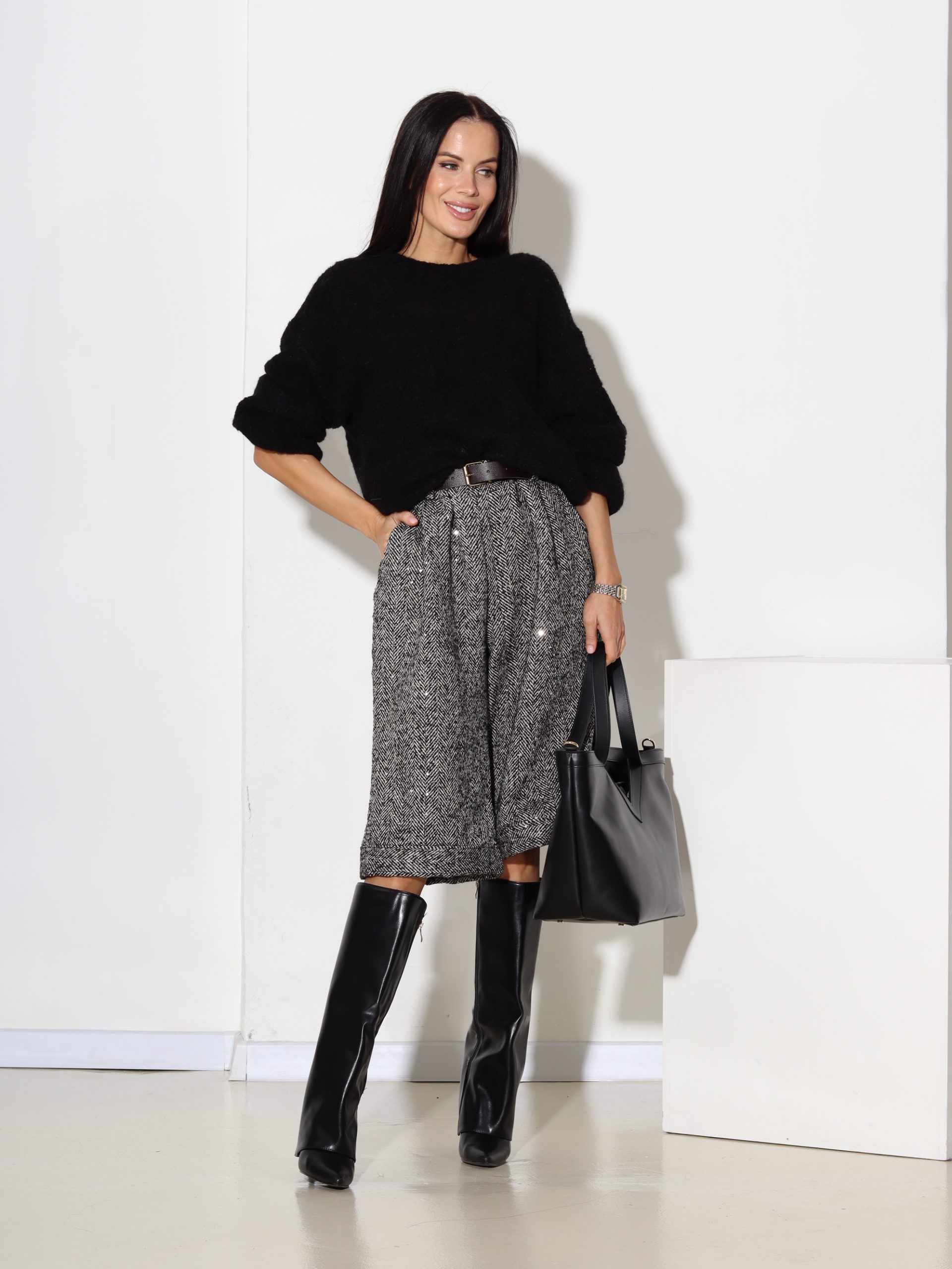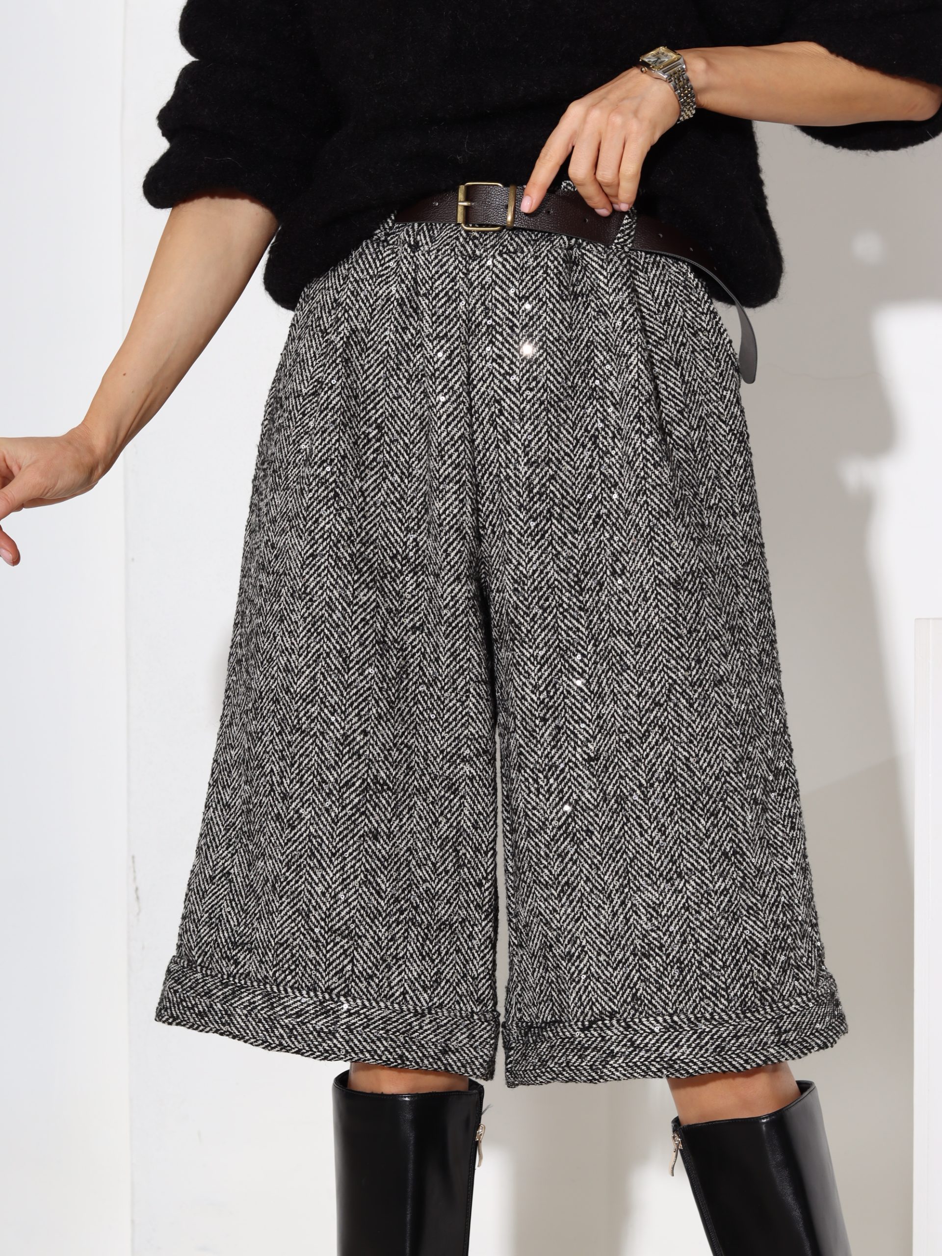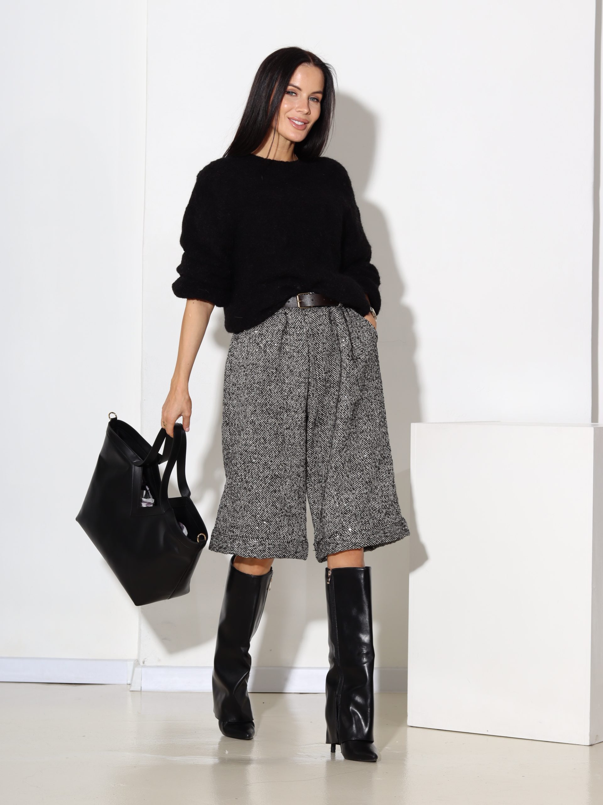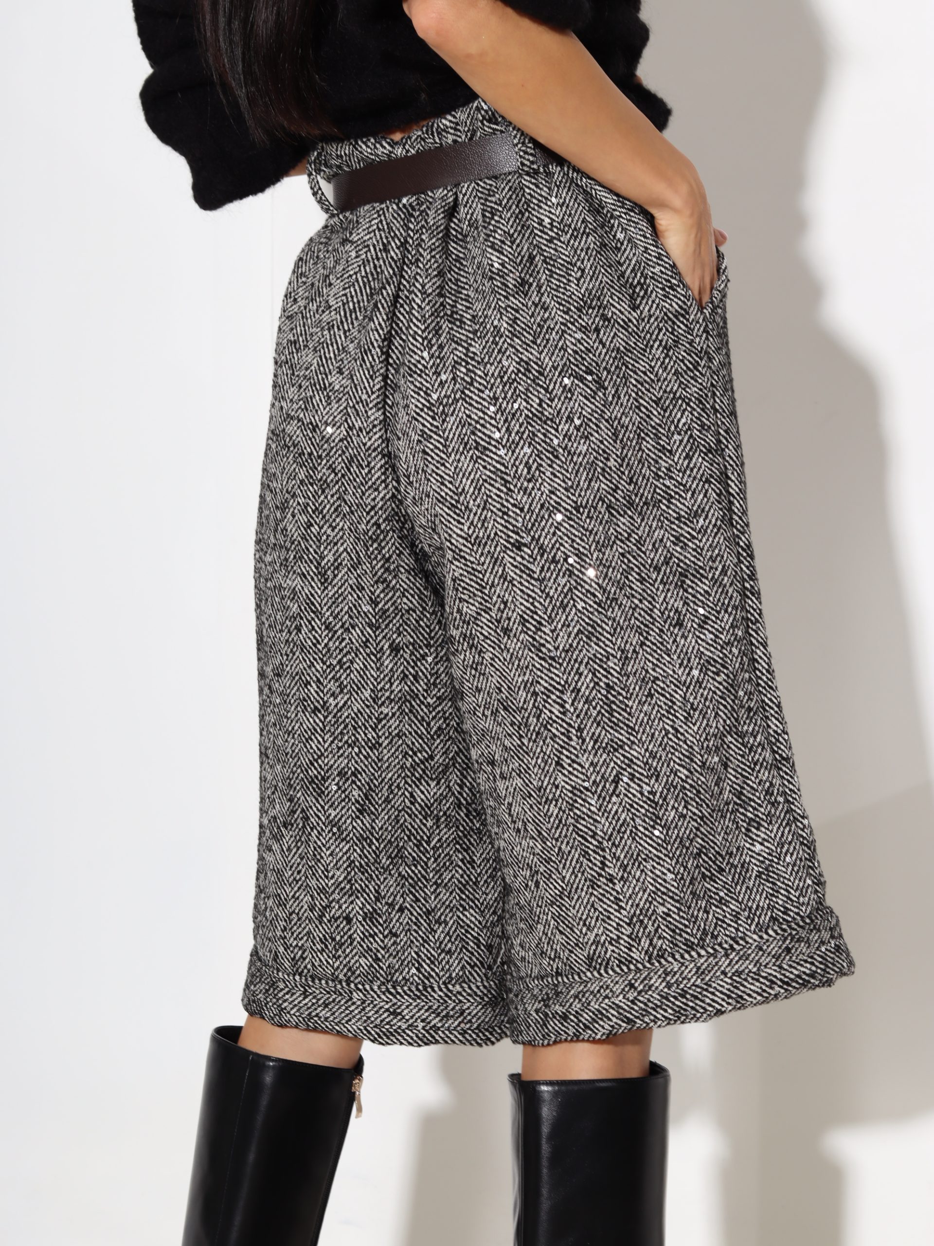 Klasiska stila šorti, Bermuda stila (pagarināti, lidz celim) priekšpusē ir iešuves, kas paplatina, klāt nāk jostiņa. Audums ir biezs skujiņrakstā, izšūts ar glitera mirdzumiņu. Šortiem vidukļa daļā gumija, ir kabatas, brīvas piegrieznes modelis ar atloku starās