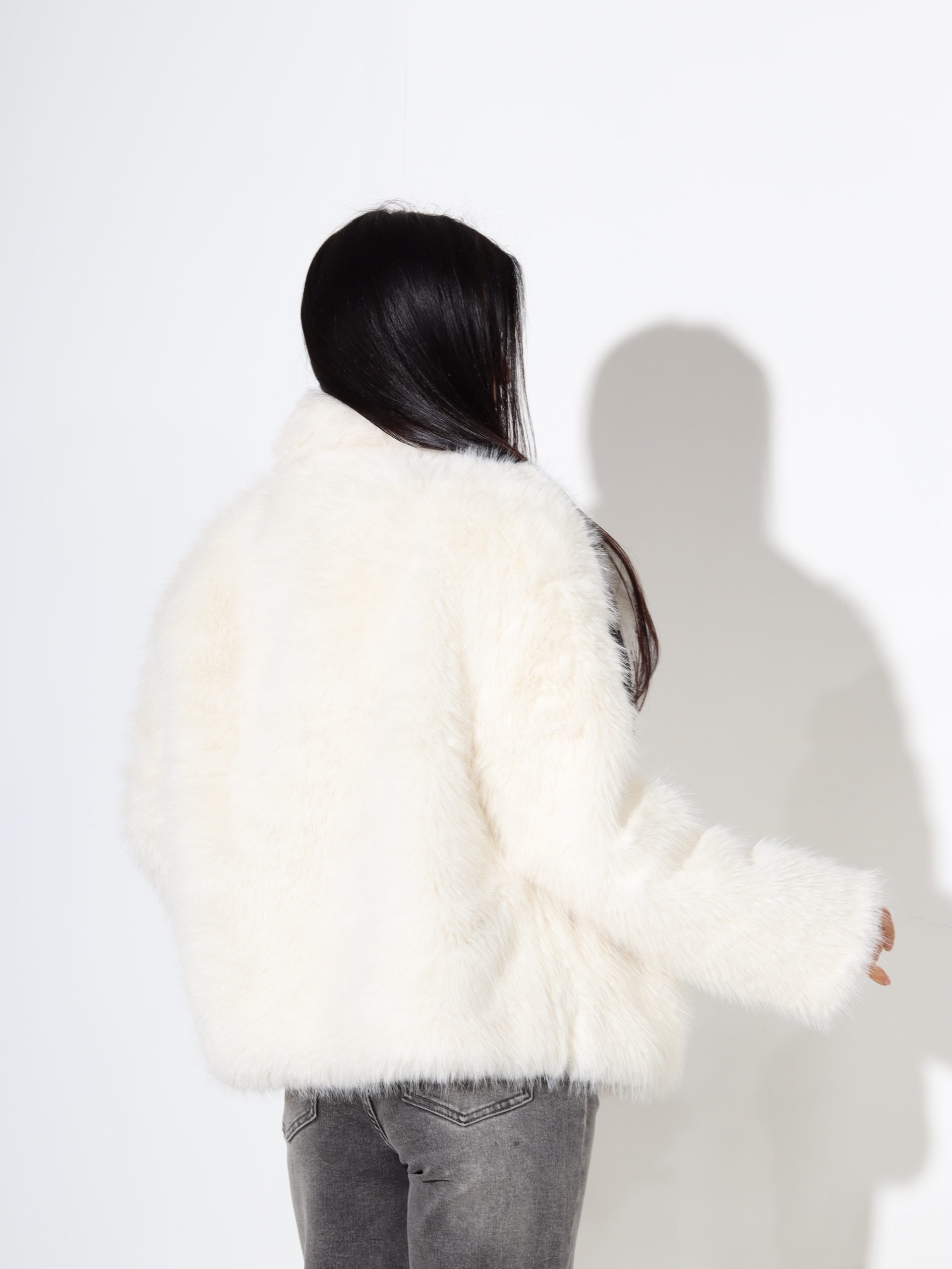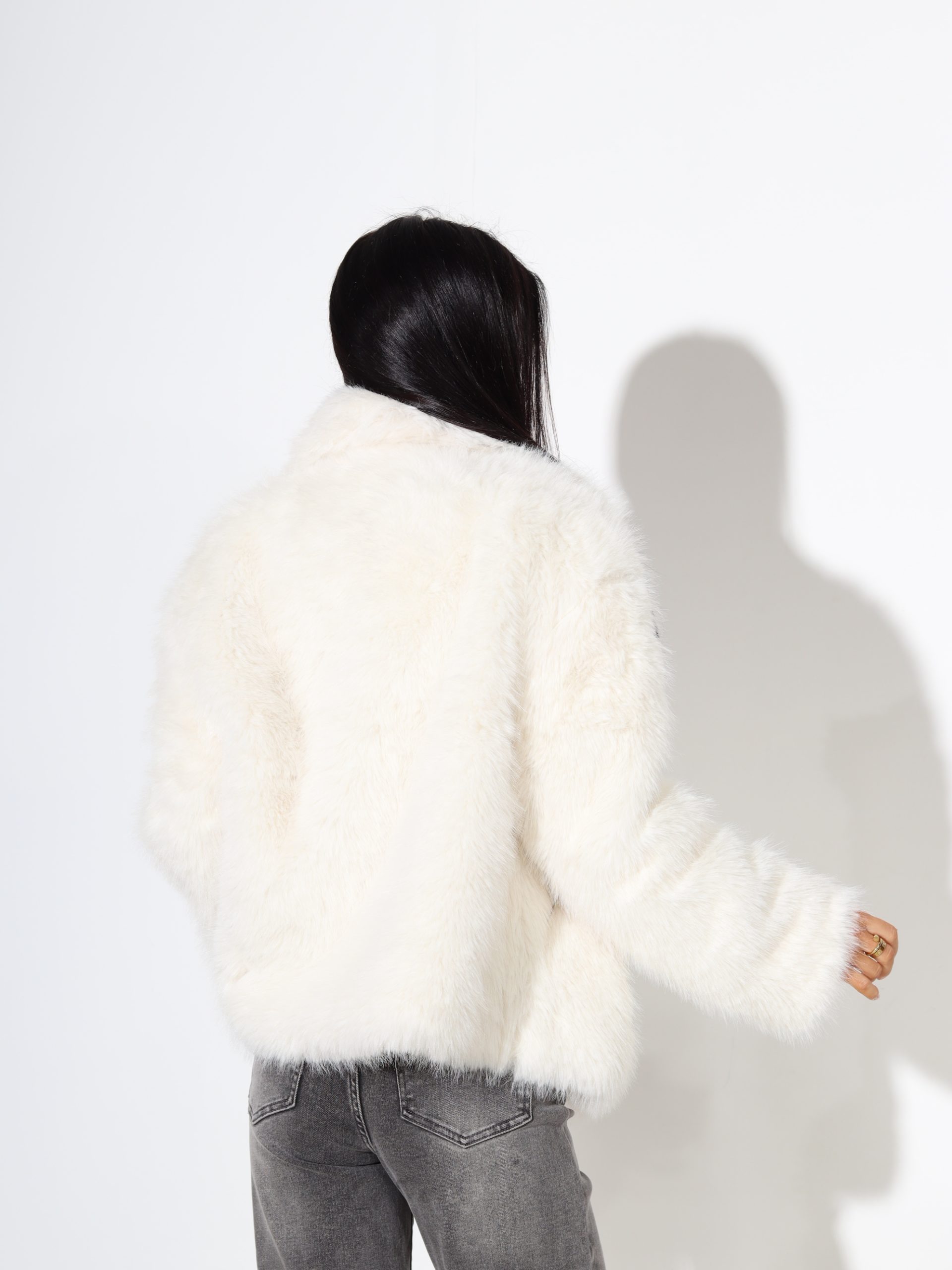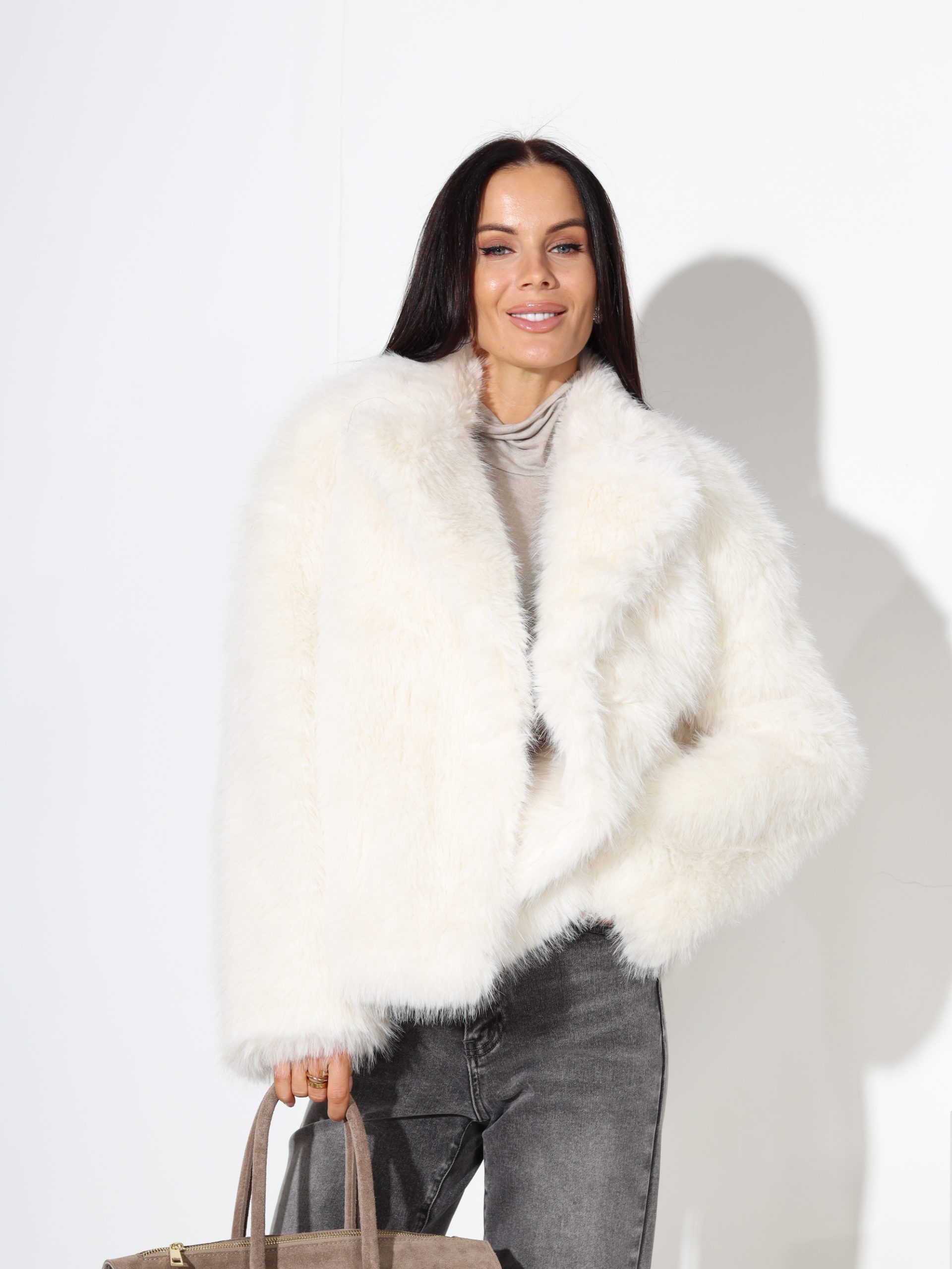 Baltas krāsas, īsas spalvas kažoks ar klasisku apkakli . Kažokam ir pieskaņotas krāsa odere un divu spiedpogu aizdare.
