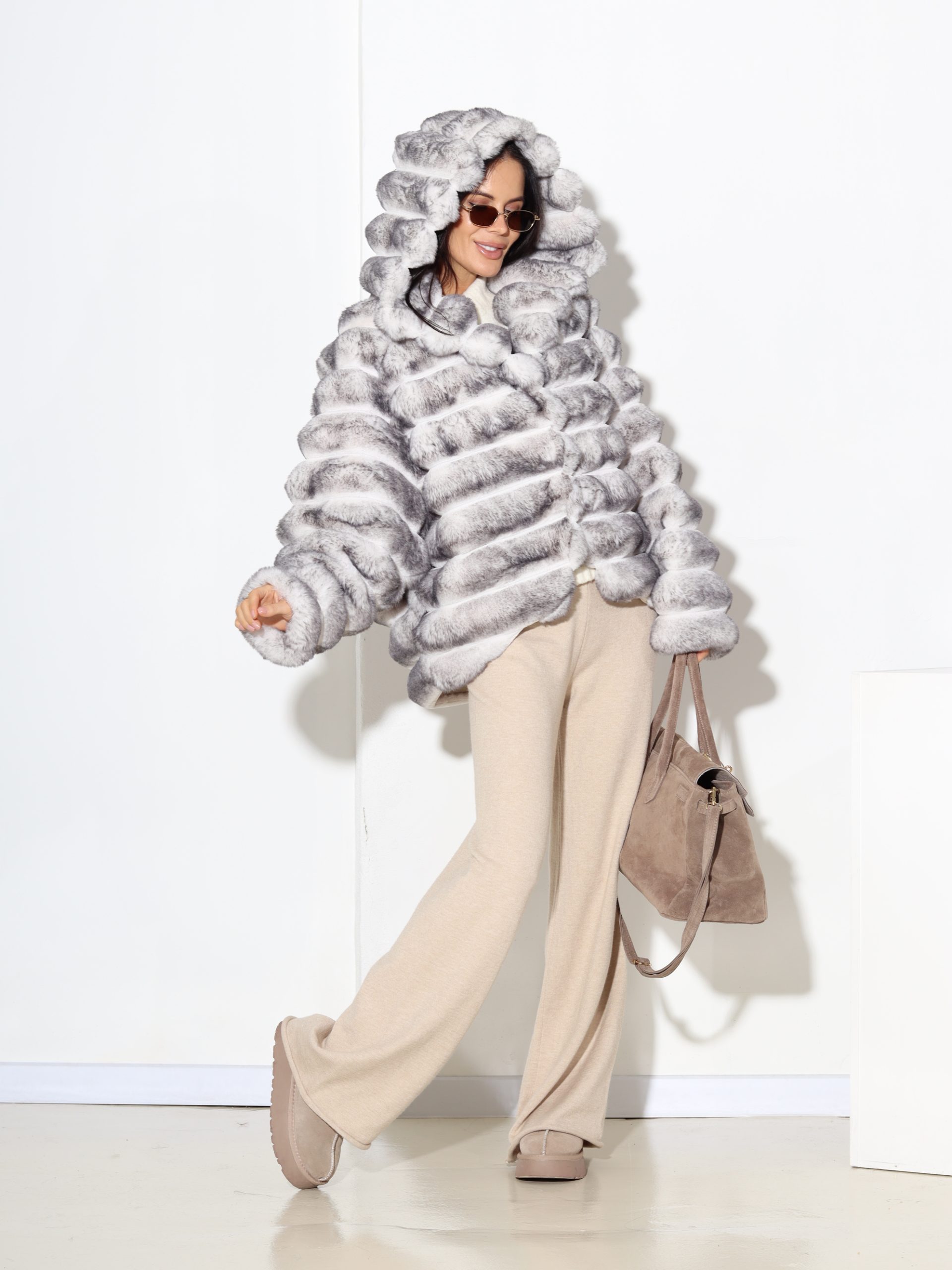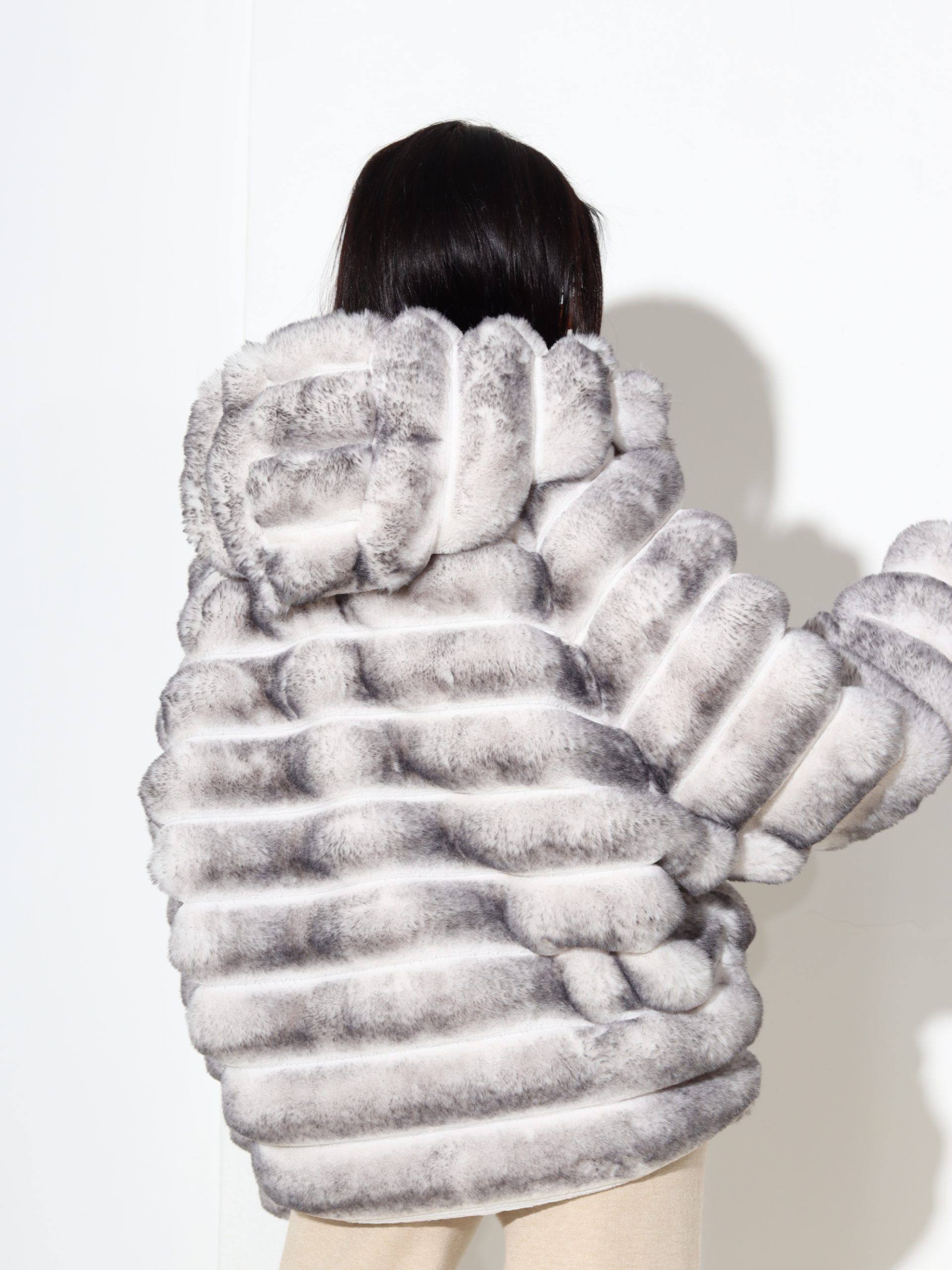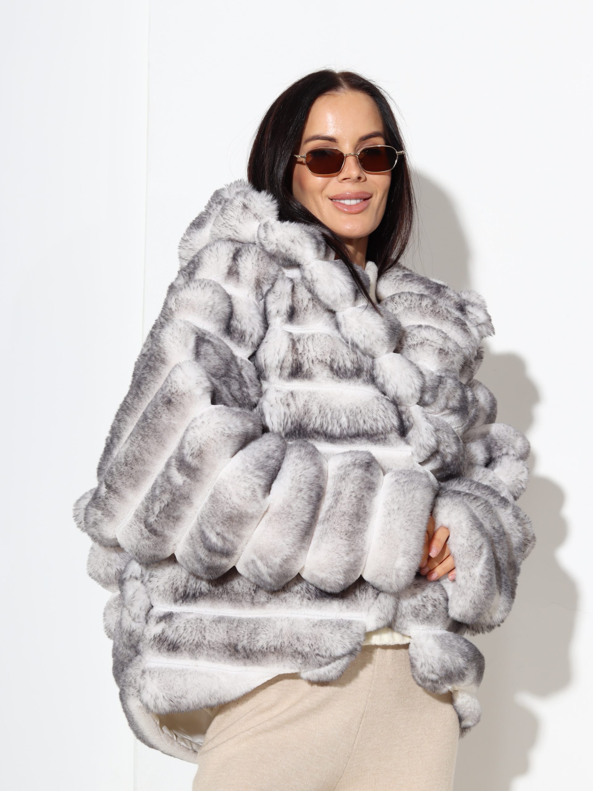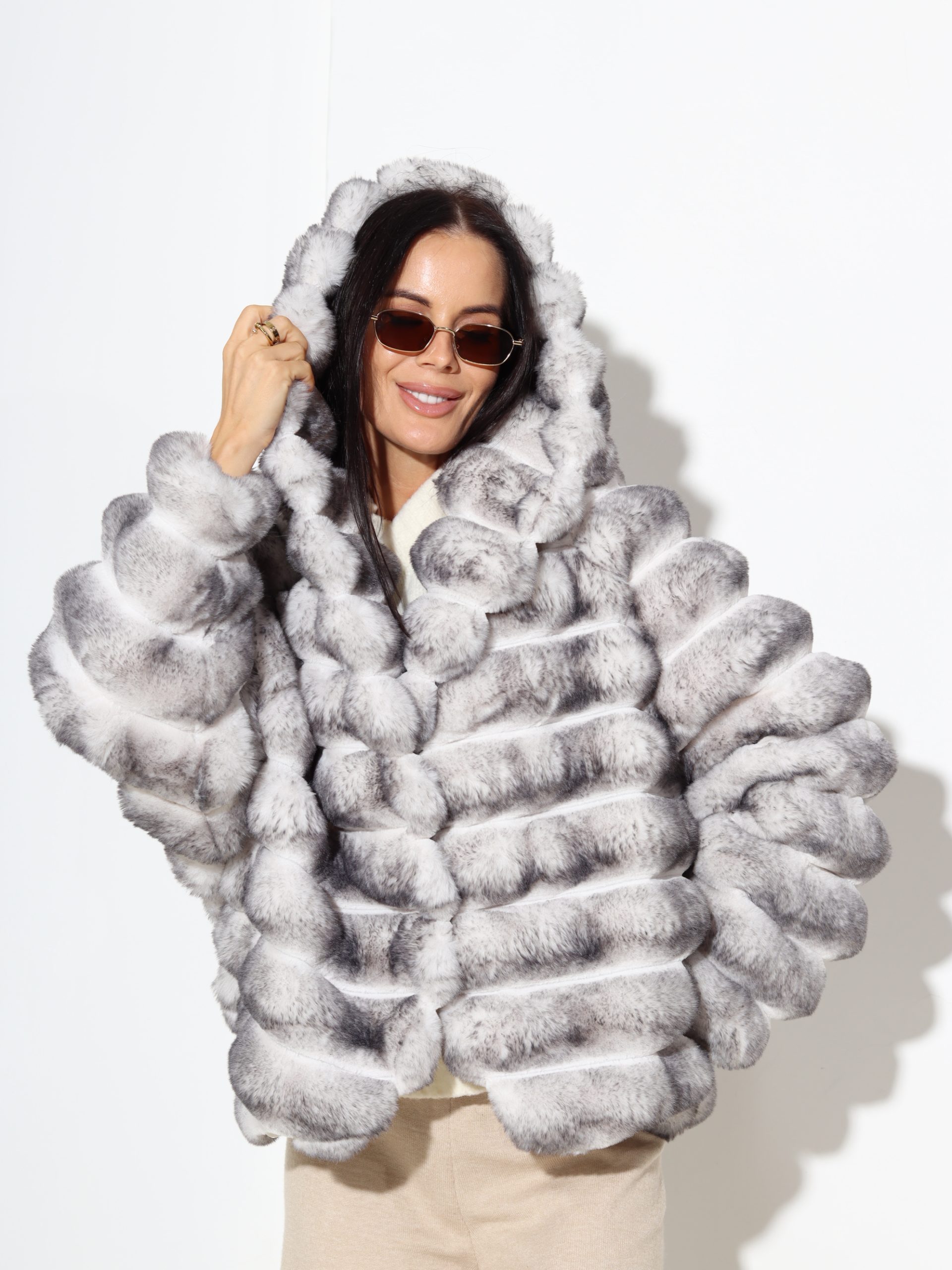 Baltas + pelēkas krāsas, horizontāli frakcionēts kažoks ar kapuci. Kažokam ir kabatas un pieskaņotas krāsas odere.