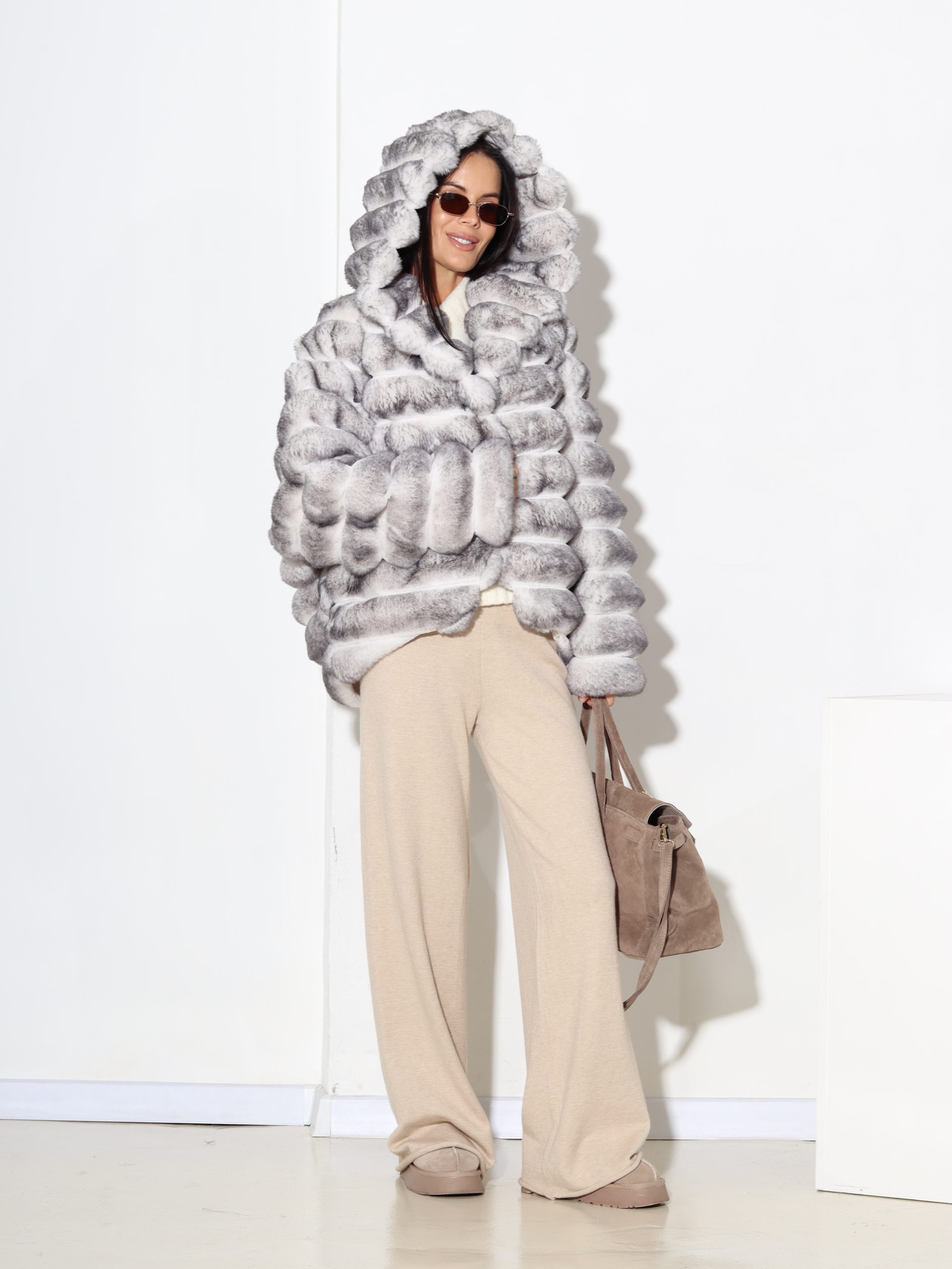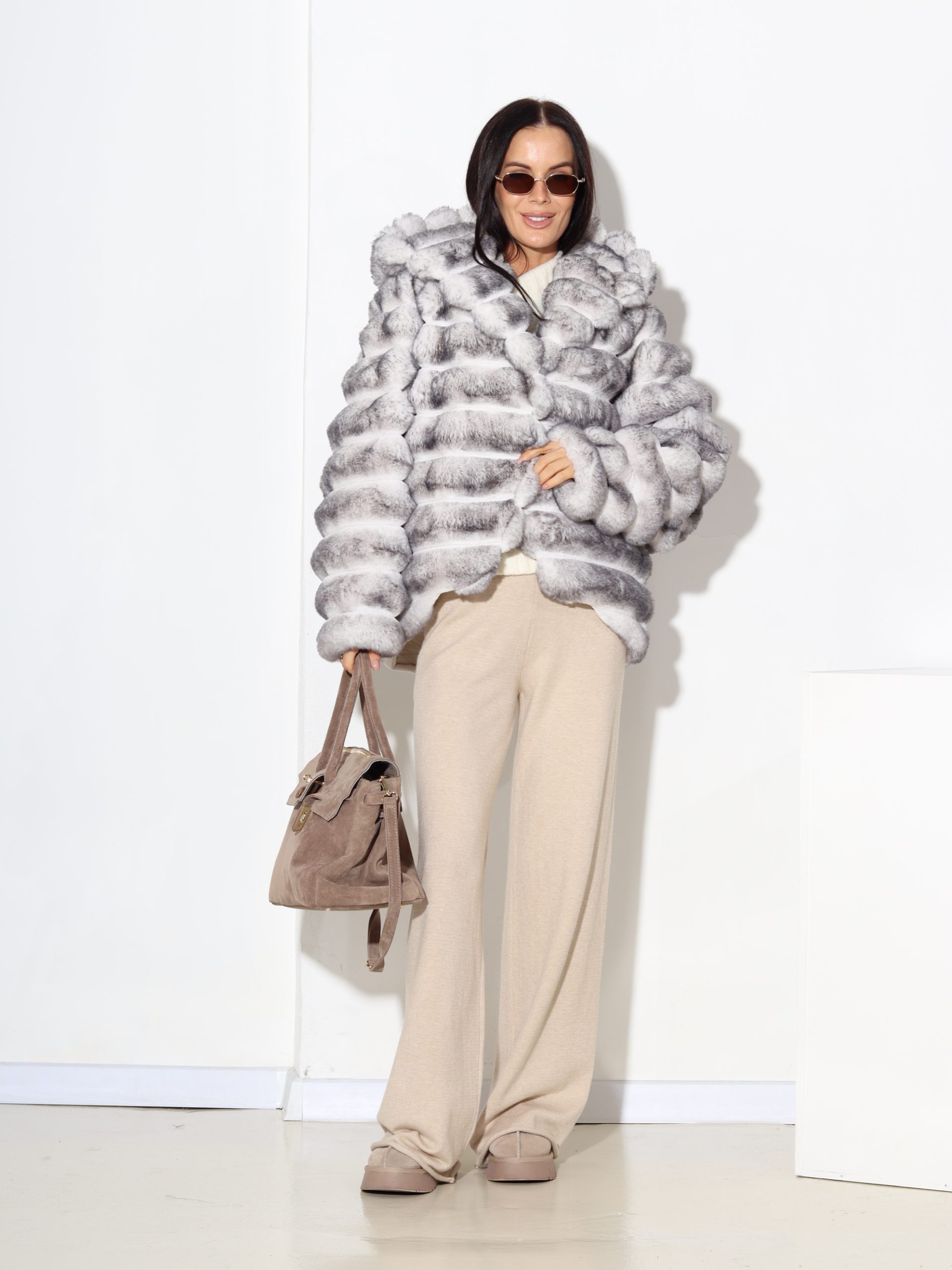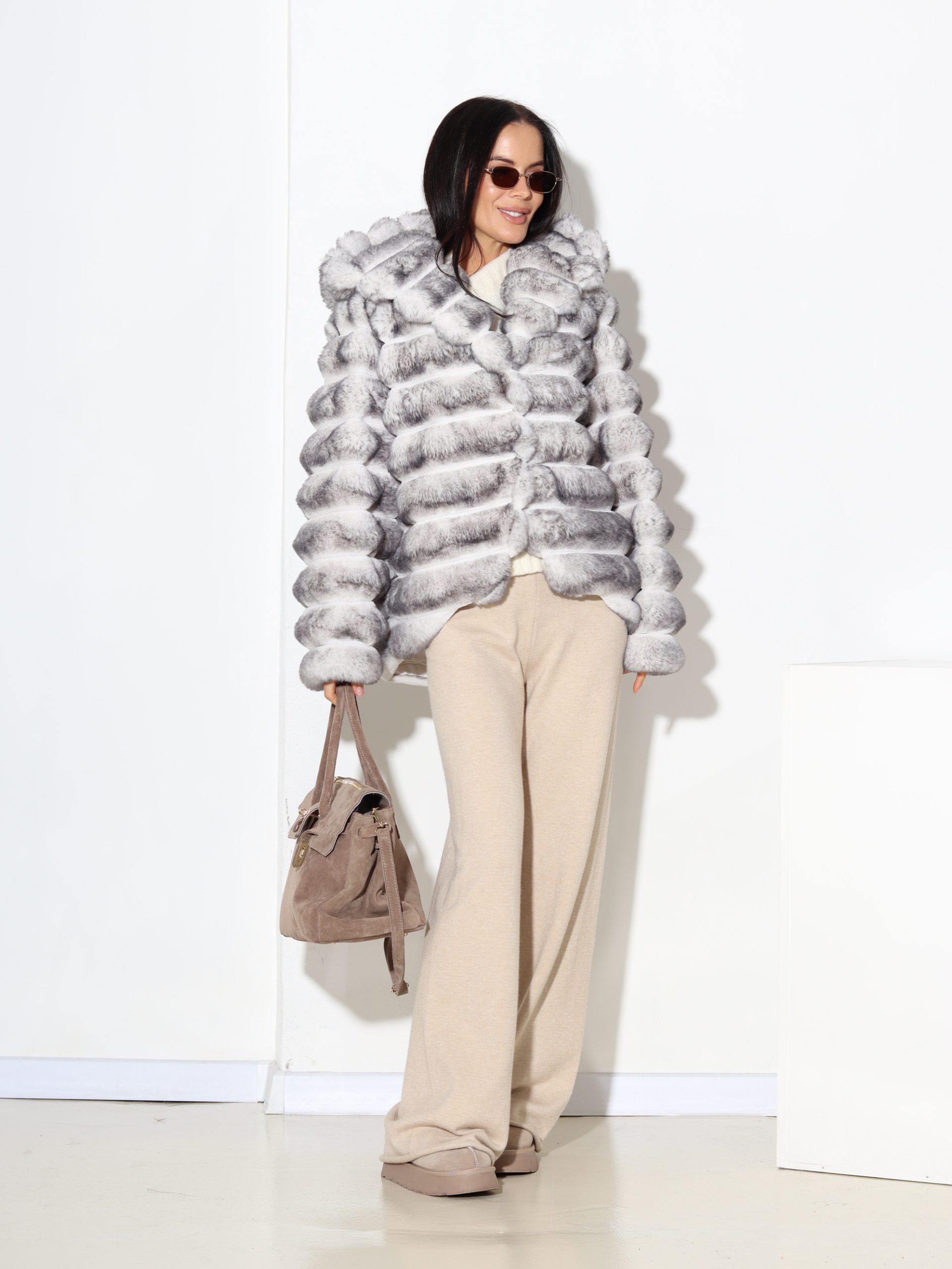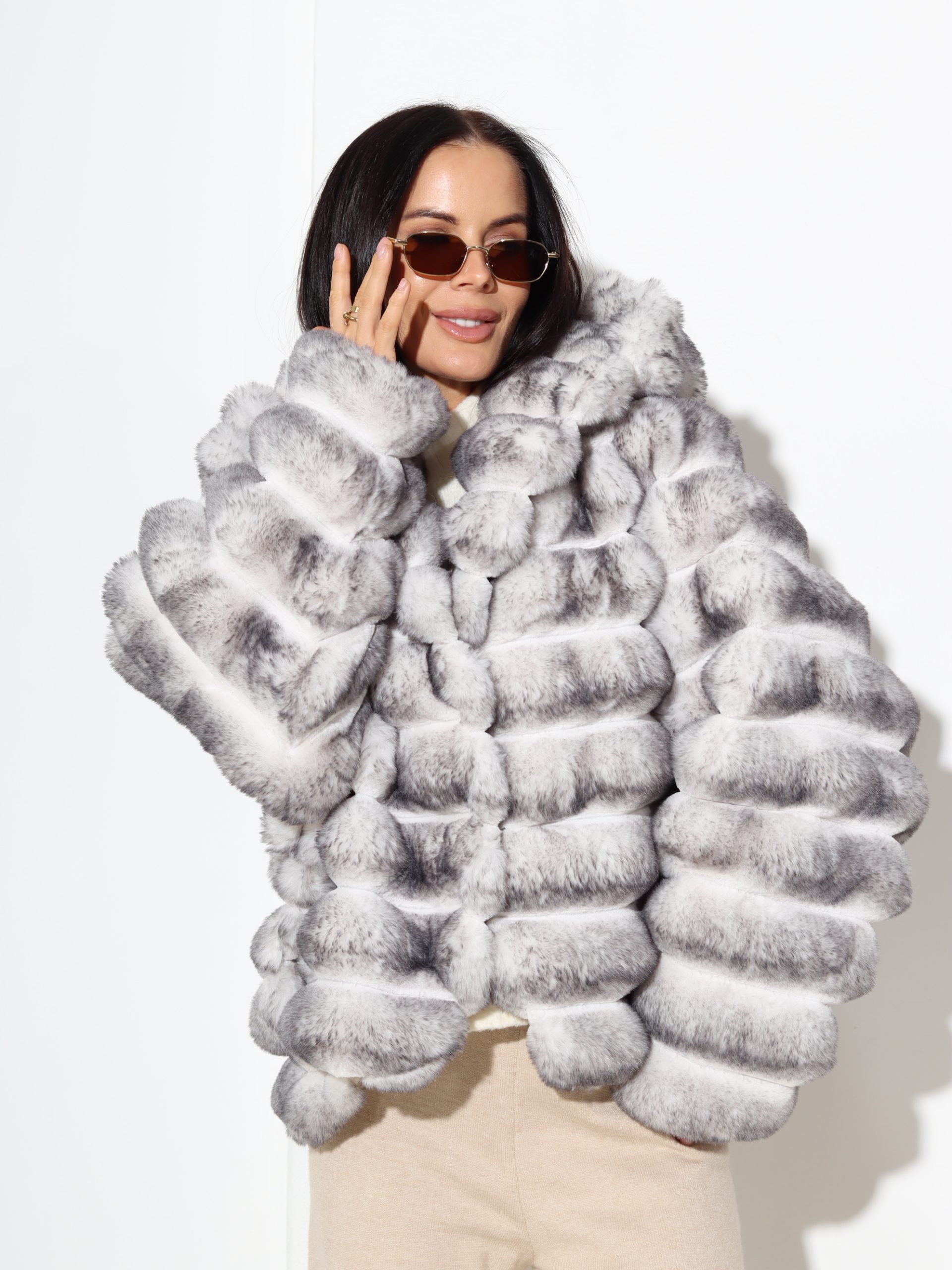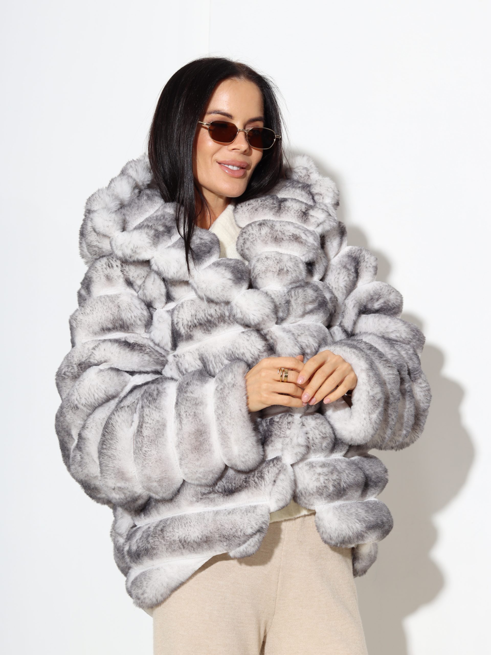 Baltas + pelēkas krāsas, horizontāli frakcionēts kažoks ar kapuci. Kažokam ir kabatas un pieskaņotas krāsas odere.
