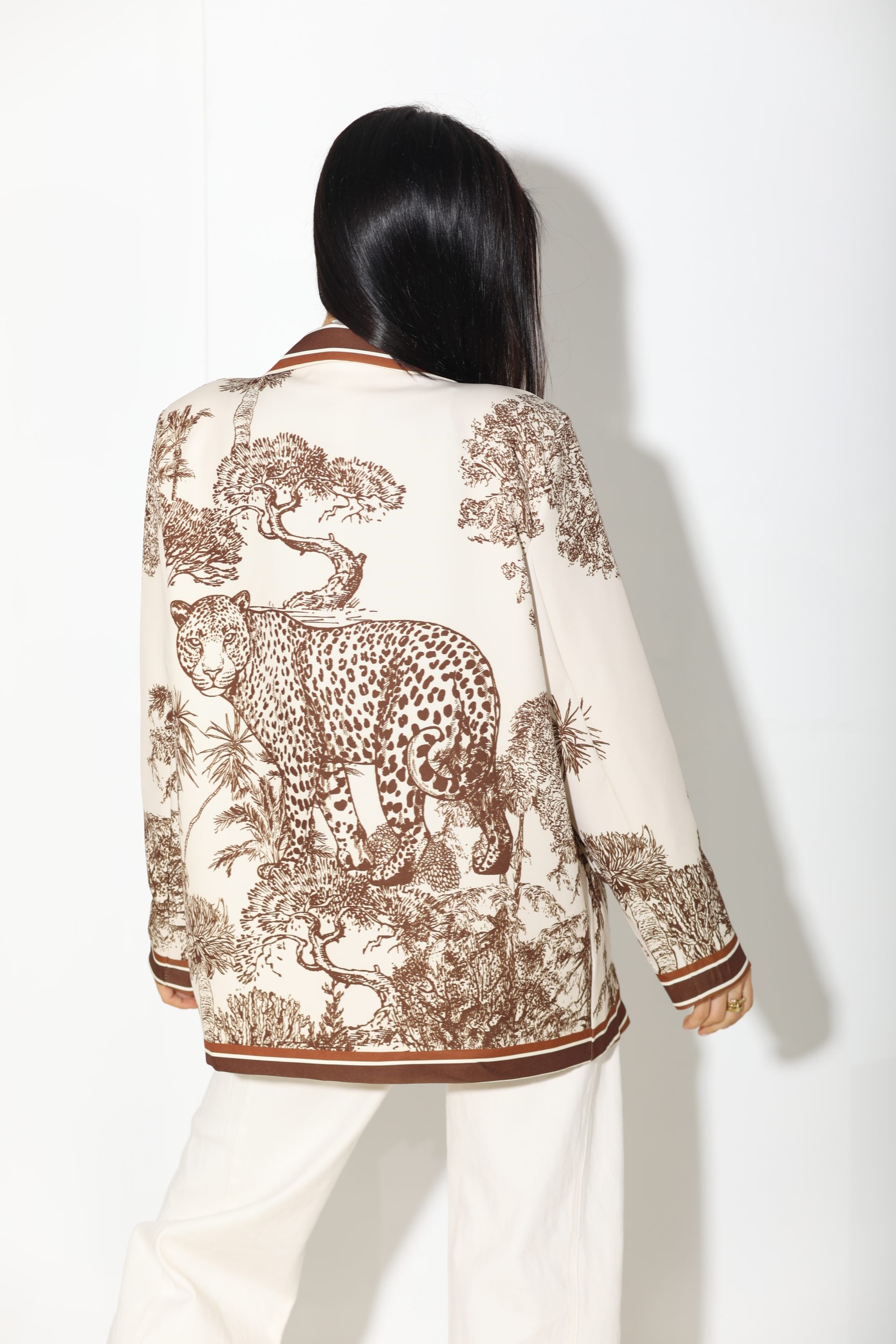 Bēša žakete ar garām piedurknēm, klasisku kakla atloku un dekoratīvām kabatām. Žaketei ir odere un skaists džungļu prints.