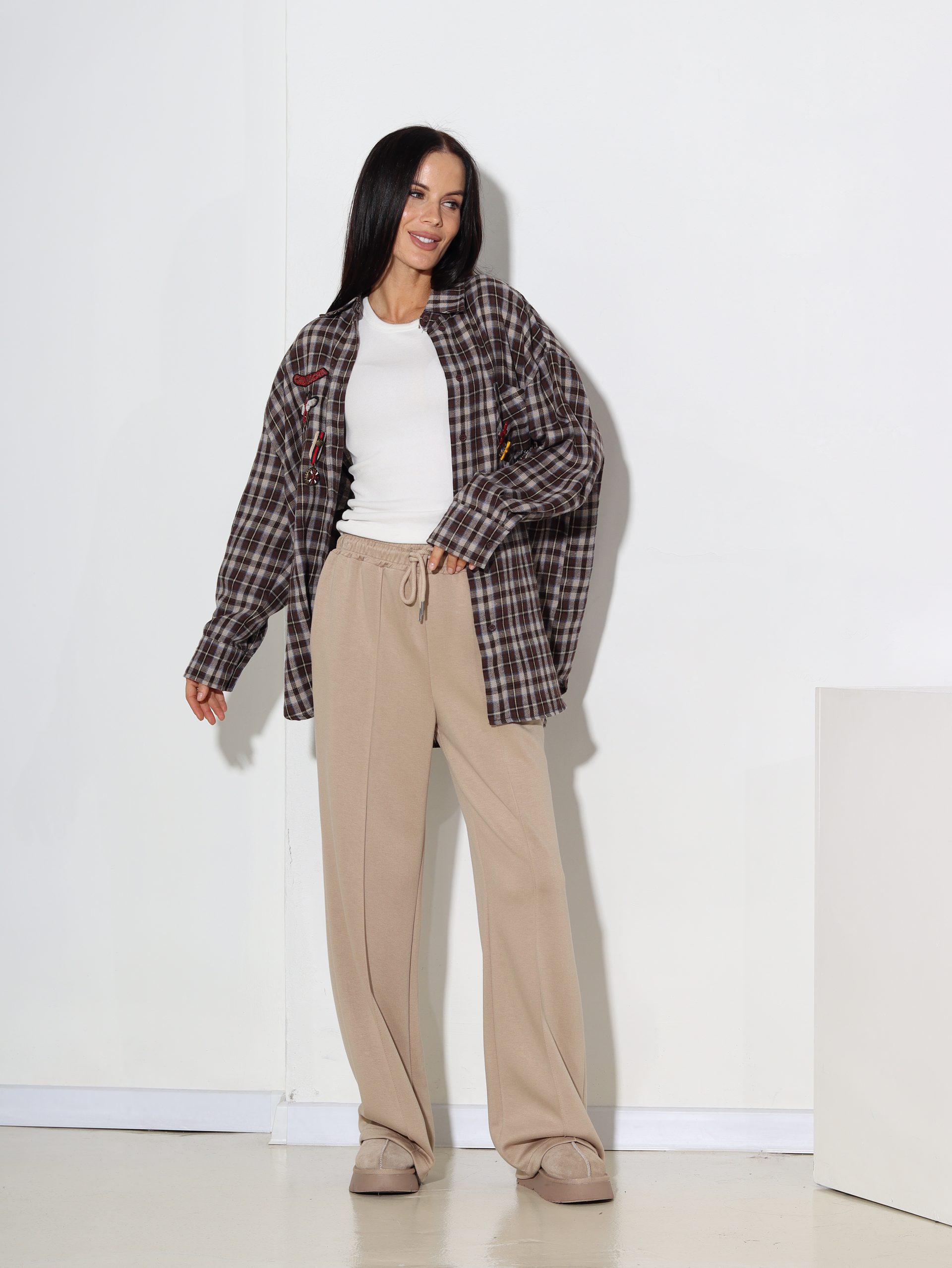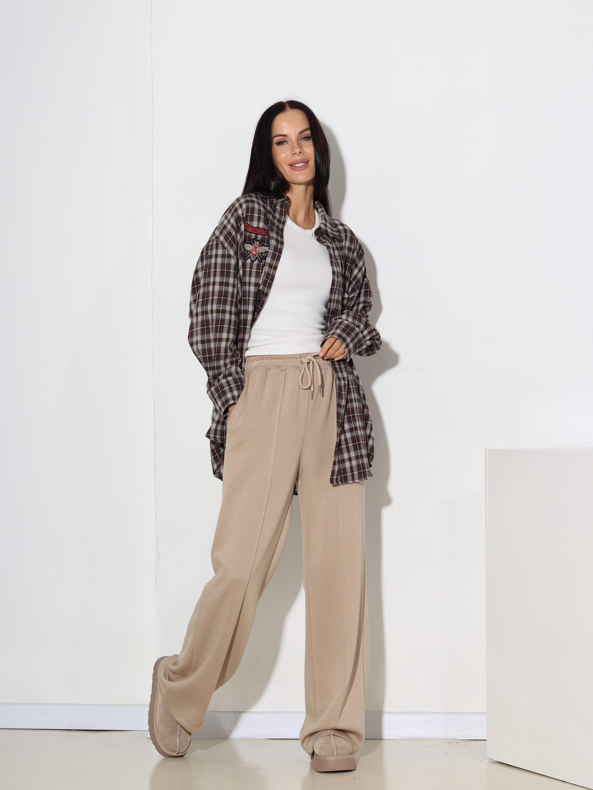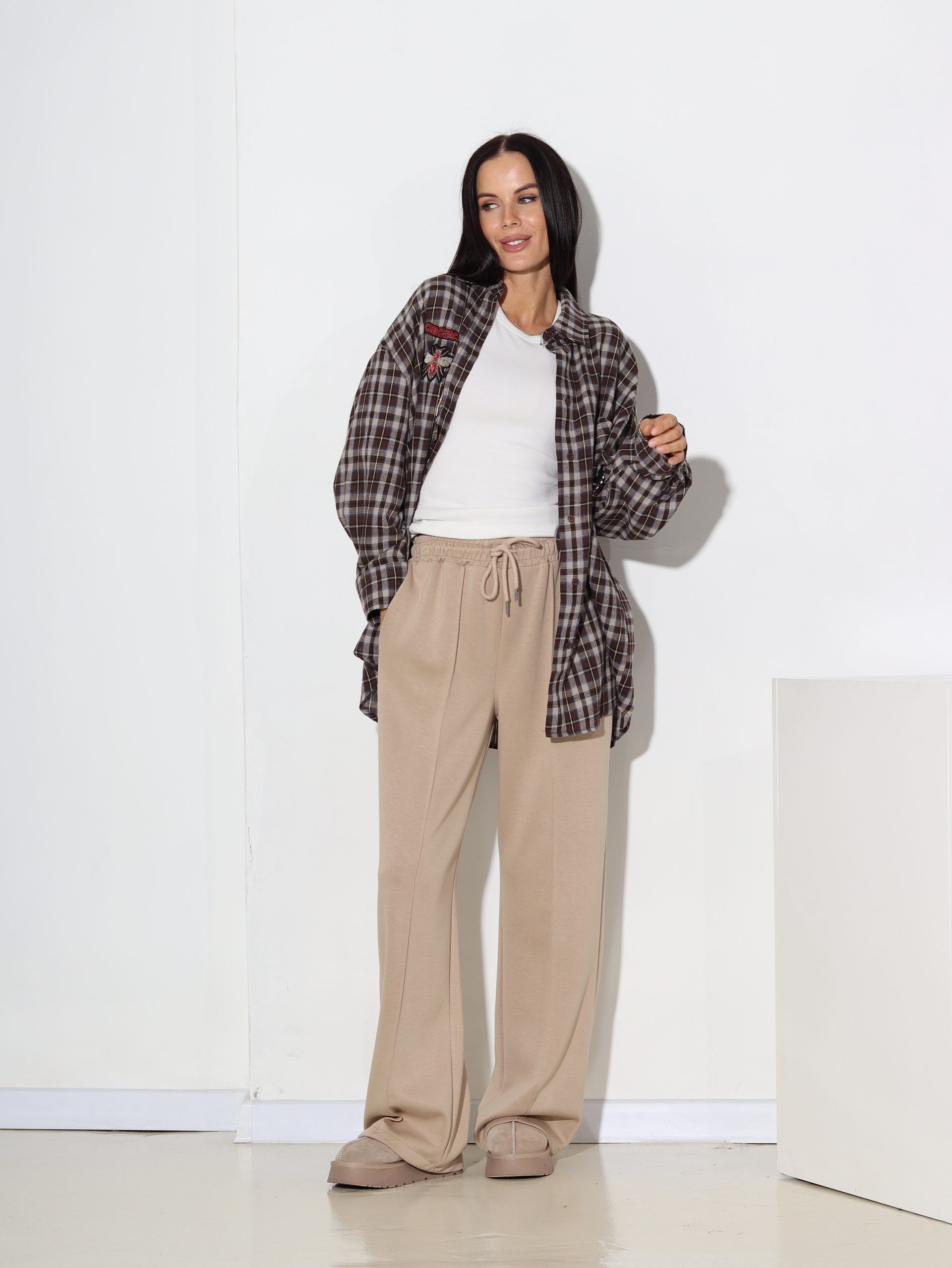 Auduma bikses sportiska stila, taisnā, paplatinātā piegriezumā. Biksēm vidukļa daļā ir iestrādāta gumija un plusos aukliņa, kuru var savilkt, biksēm ir kabatiņas un dekoratīvi nošūta vīlīte visa stara garumā.
