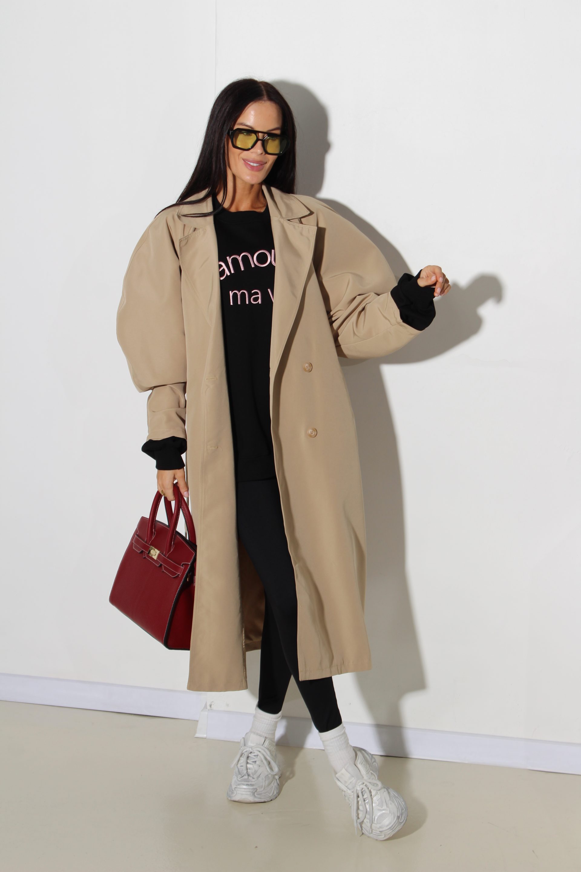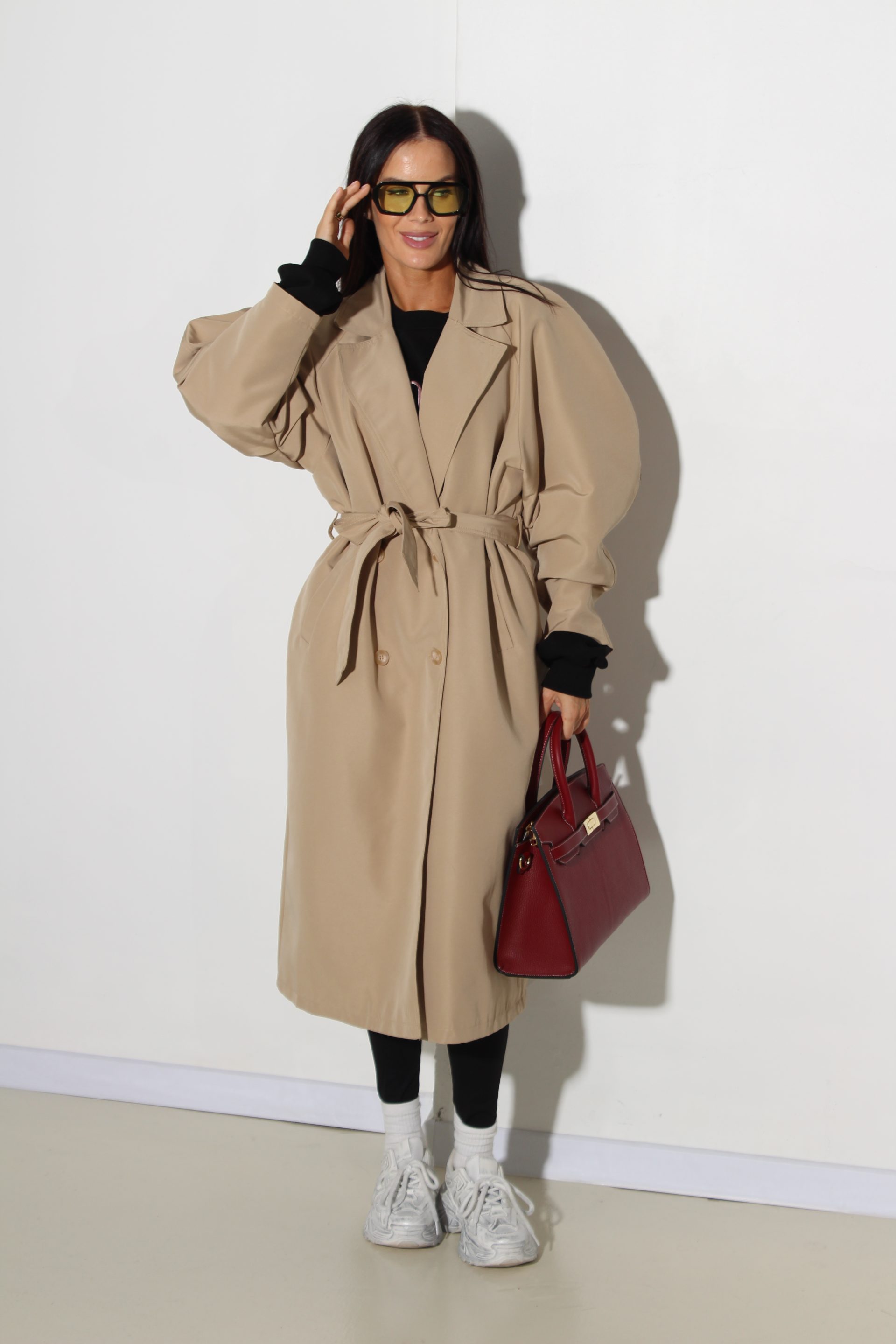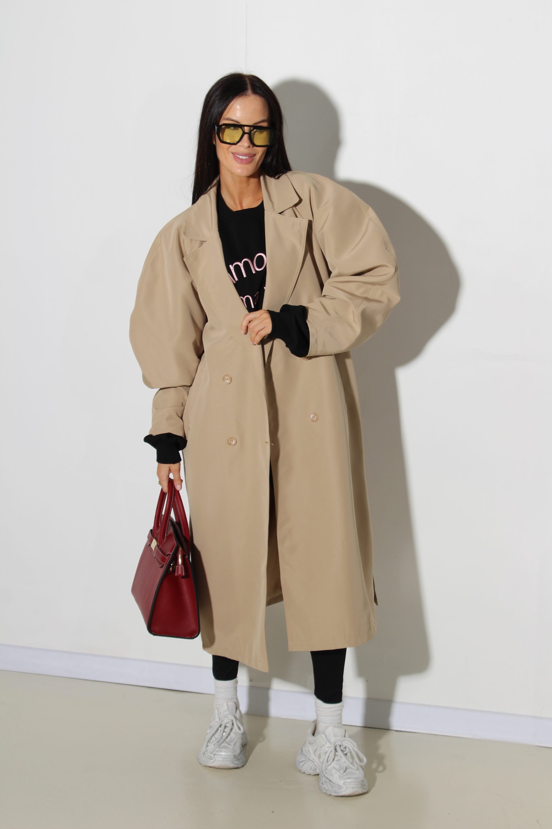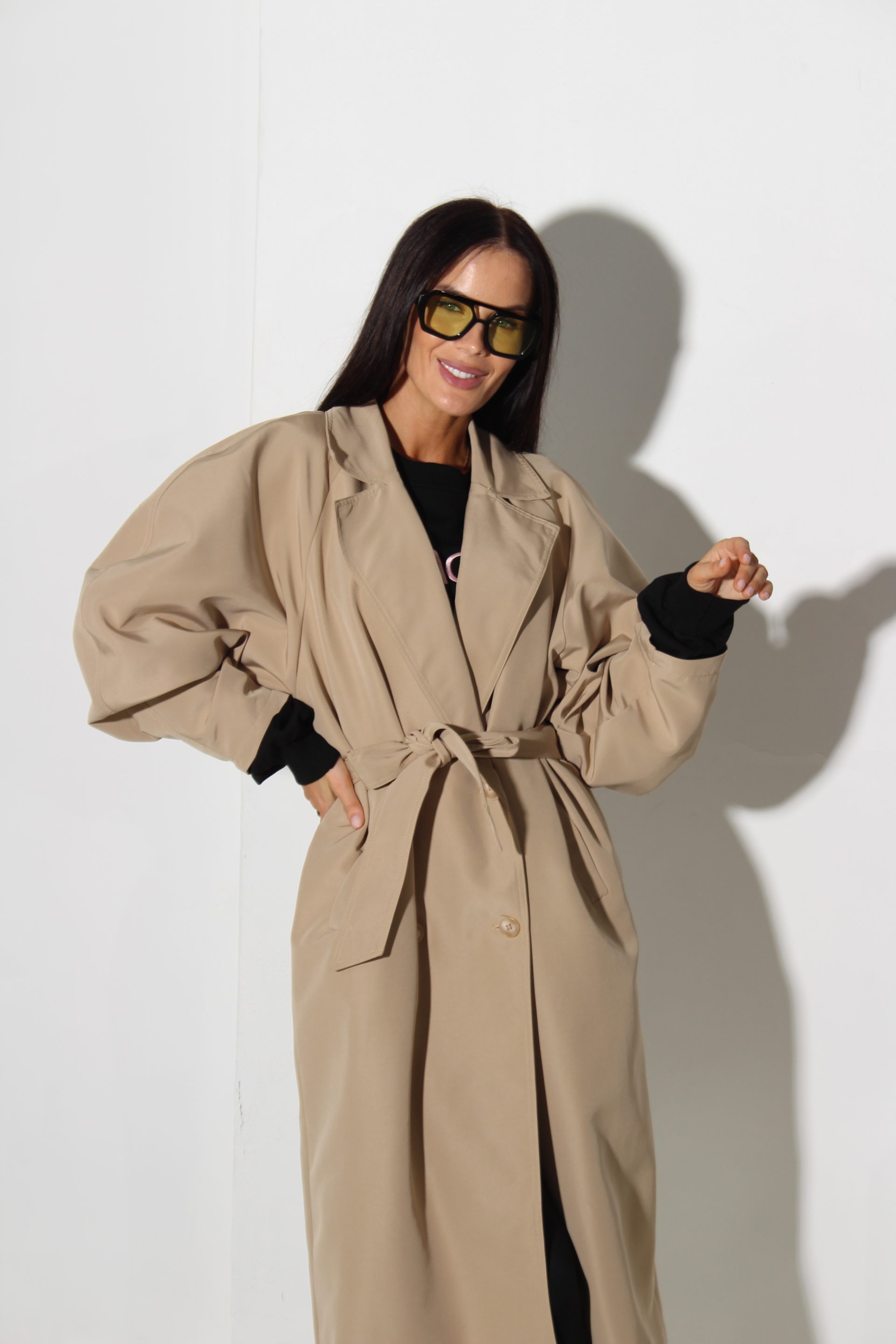 Bēšas krāsas klasisks trencis. Trencim ir klasisks kakla atloks, ir kabatas, divrindu podziņu aizdare un viduklim jostiņa